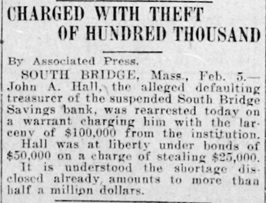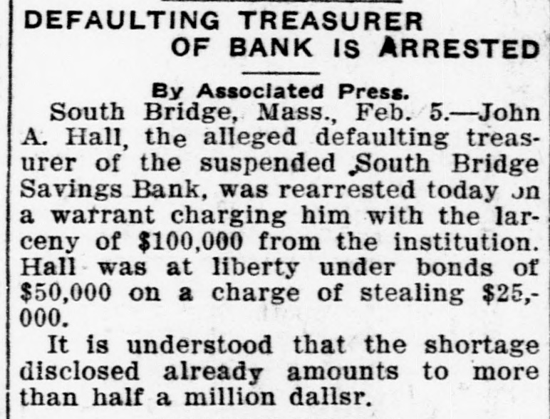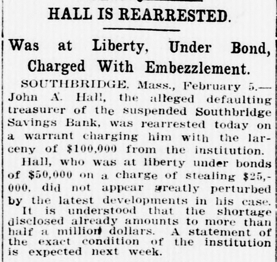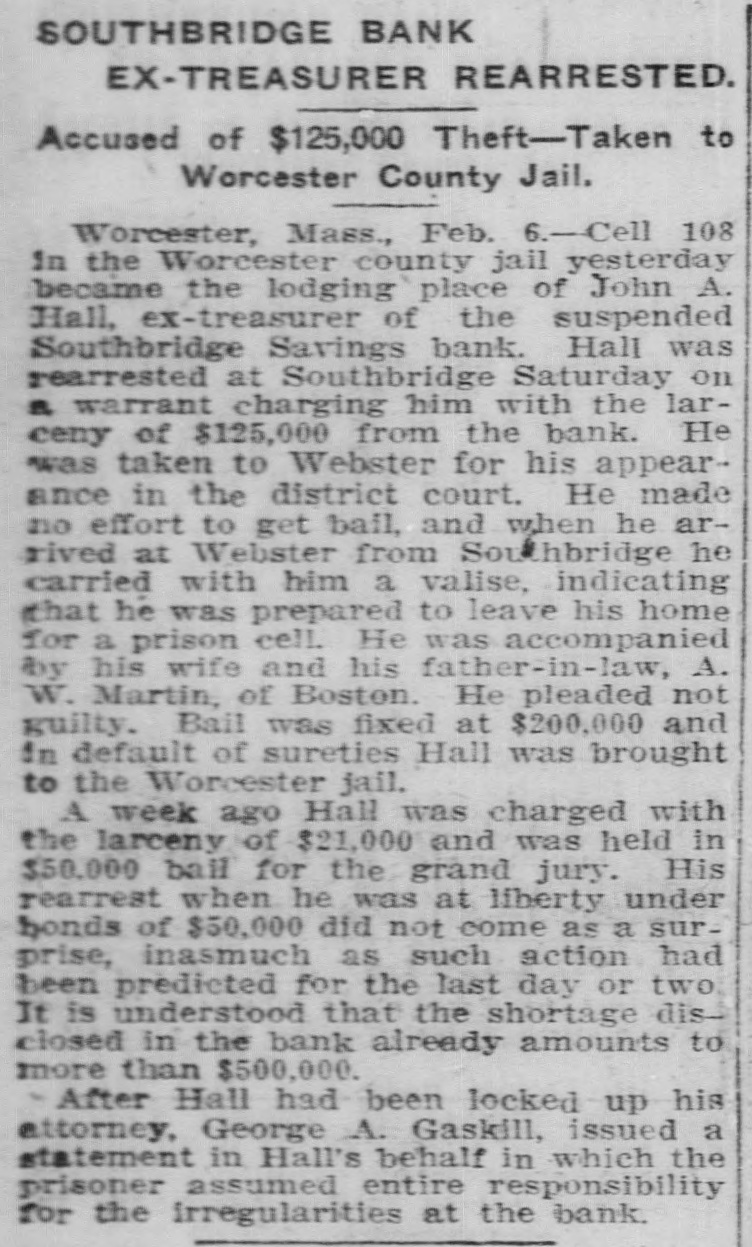SOUTHBRIDGE BANK EX-TREASURER REARRESTED. Accused of $125,000 Theft-Taken to Worcester County Jail. Worcester, Mass., Feb. 6.-Cell 108 in the Worcester county jail yesterday became the lodging place of John A. Hall, ex-treasurer of the suspended Southbridge Savings bank. Hall was rearrested at Southbridge Saturday on a warrant charging him with the larceny of $125,000 from the bank. He was taken to Webster for his appearance in the district court. He made no effort to get bail, and when he arrived at Webster from Southbridge he carried with him a valise, indicating that he was prepared to leave his home for a prison cell. He was accompanied by his wife and his father-in-law, A. W. Martin, of Boston. He pleaded not guilty. Bail was fixed at $200,000 and in default of sureties Hall was brought to the Worcester jail. A week ago Hall was charged with the larceny of $21,000 and was held in $50.000 bail for the grand jury. His rearrest when he was at liberty under bonds of $50,000 did not come as a surprise, inasmuch as such action had been predicted for the last day or two It is understood that the shortage disclosed in the bank already amounts to more than $500,000. After Hall had been locked up his attorney, George A. Gaskill, issued a statement in Hall's behalf in which the prisoner assumed entire responsibility for the irregularities at the bank.