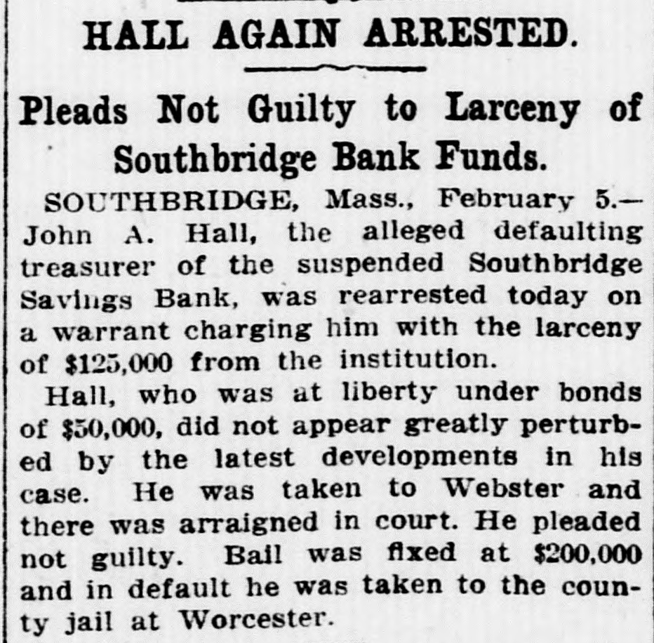 HALL AGAIN ARRESTED. Pleads Not Guilty to Larceny of Southbridge Bank Funds. SOUTHBRIDGE, Mass., February 5.John A. Hall, the alleged defaulting treasurer of the suspended Southbridge Savings Bank, was rearrested today on a warrant charging him with the larceny of $125,000 from the institution. Hall, who was at liberty under bonds of $50,000, did not appear greatly perturbed by the latest developments in his case. He was taken to Webster and there was arraigned in court. He pleaded not guilty. Bail was fixed at $200,000 and in default he was taken to the county jail at Worcester.