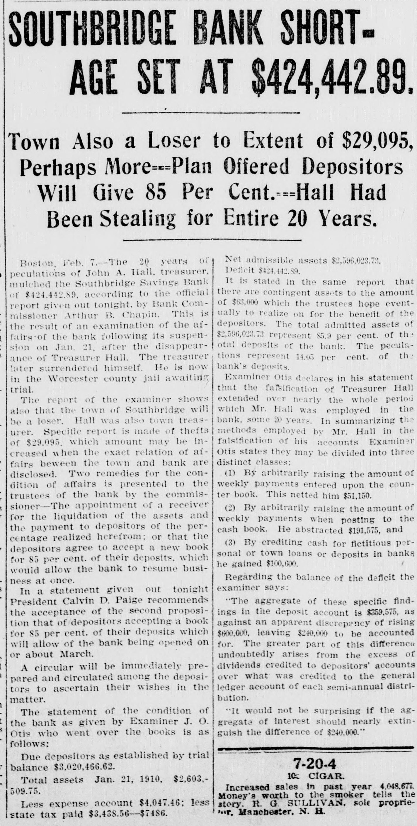 SOUTHBRIDGE BANK SHORTAGE SET AT $424,442.89. Town Also a Loser to Extent of $29,095, Perhaps More==Plan Offered Depositors Will Give 85 Per Cent.--Hall Had Been Stealing for Entire 20 Years. Net admissible assets $2,596,023.73. Boston, Feb. 7.-The 20 years of Deficit $424,442.89. peculations of John A. Hall. treasurer. It is stated in the same report that mulched the Southbridge Savings Bank there are contingent assets to the amount of $424,442.89. according to the official of $63,000 which the trustees hope eventreport given out tonight. by Bank Comually to realize on for the benefit of the missioner Arthur B. Chapin. This is depositors. The total admitted assets of the result of an examination of the af$2,596,023.73 represent 85.9 per cent. of the fairs of the bank following its suspenotal deposits of the bank. The peculasion on Jan. 21, after the disappeartions represent 14.05 per cent. of the ance of Treasurer Hall. The treasurer bank's deposits. later surrendered himself. He is now Examiner Otis declares in his statement in the Worcester county jail awaiting that the falsification of Treasurer Hall trial. extended over nearly the whole period The report of the examiner shows also that the town of Southbridge will which Mr. Hall was employed in the bank. some 20 years. In summarizing the be a loser. Hall was also town treasmethods employed by Mr. Hall in the urer. Specific report is made of thefts falsification of his accounts Examiner of $29,095. which amount may be inOtis states they may be divided into three creased when the exact relation of afdistinct classes: fairs beween the town and bank are disclosed. Two remedies for the con(1) By arbitrarily raising the amount of dition of affairs is presented to the weekly payments entered upon the countrustees of the bank by the commister book. This netted him $51,150. sioner-The appointment of a receiver (2) By arbitrarily raising the amount of for the liquidation of the assets and weekly payments when posting to the the payment to depositors of the percash book. He abstracted $191,575, and centage realized herefrom: or that the (3) By crediting cash for fictitious perdepositors agree to accept a new book sonal or town loans or deposits in banks for 85 per cent. of their deposits. which he gained $100,600. would allow the bank to resume busiRegarding the balance of the deficit the ness at once. examiner says: In a statement given out tonight President Calvin D. Paige recommends "The aggregate of these specific findings in the deposit account is $359,575. as the acceptance of the second proposition that of depositors accepting a book against an apparent discrepancy of rising $600,000. leaving $240,000 to be accounted for 85 per cent. of their deposits which will allow of the bank being opened on for. The greater part of this difference or about March. undoubtedly arises from the excess of dividends credited to depositors' accounts A circular will be immediately preover what was credited to the general pared and circulated among the deposiledger account of each semi-annual distritors to ascertain their wishes in the bution. matter. "It would not be surprising if the agThe statement of the condition of gregate of interest should nearly extinthe bank as given by Examiner J. O. Otis who went over the books is as guish the difference of $240,000." follows: Due depositors as established by trial 7-20-4 balance $3,020,466.62. 10c CIGAR. Total assets Jan. 21, 1910, $2,603,Increased sales in past year 4,048,677. 509.75. Money's worth to the smoker tells the story. R. G. SULLIVAN. sole proprieLess expense account $4,047.46; less mr. Manchester. N. H. state tax paid $3,438.56-$7486.