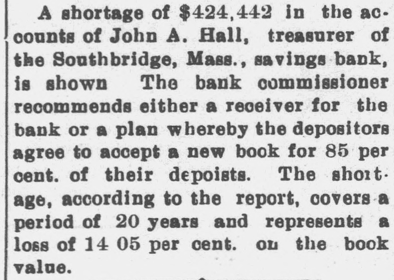 A shortage of $424,442 in the accounts of John A. Hall, treasurer of the Southbridge, Mass., savings bank, is shown The bank commissioner recommends either a receiver for the bank or a plan whereby the depositors agree to accept a new book for 85 per cent. of their depoists. The shoit. age, according to the report, covers . a period of 20 years and represents a loss of 14 05 per cent. ou the book value.