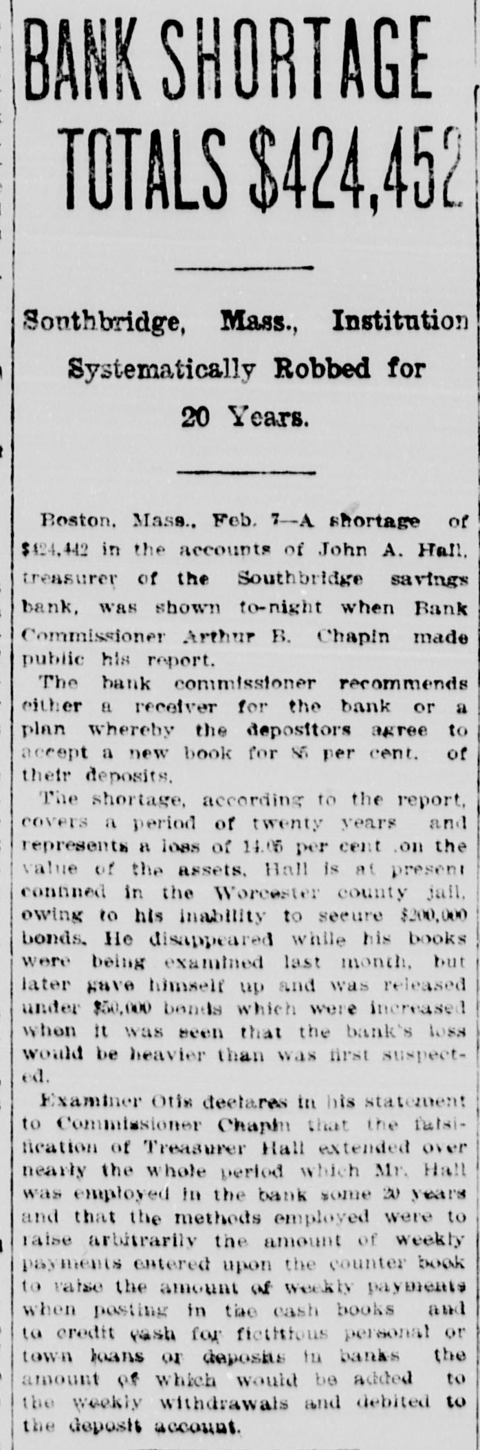 SHORTAGE OF $424,442. Report of Southbridge Bank Made Public. Boston, Feb. 7-A shortage of $424,443 in the accounts of John A. Hall. treasurer of the Southbridge Savings Bank, was shown to-night when Bank Commissioner Arthur B. Chapin made public his report. The Bank Commissioner recommends either a receiver for the bank or a plan whereby the depositors agree to accept a new book for & per cent of their deposits. President Calvin D. Paige of the bank. in a statement made to-night, and Commissioner Chapin both favor the acceptance of the second proposition, which would enable the bank to resume business March 1. The shortage, according to the report. covers a period of twenty years and represents a loss of 14.06 per cent on the book value of the assets. Hall is at present confined in the Worcester County jail, owing to his inability to secure $200,000 bonds. He disappeared while the examination of his books were being made last month. but later gave himself up and was released under $50,000 bonds, which were increased when it was seen that the bank's loss would be heavier than was at first suspected. Bank Examiner Otis declared in his statement to Commissioner Chapin that the falsifications of Hall extended over nearly the whole period which Mr. Hall was employed in the bank-some twenty years-and that the methods employed were to raise arbitrarily the amount of weekly payments entered on the counter book, to raise the amount of weekly payments when posting in the cash books and to credit cash for fictitious personal or town loans or deposits in banks, the amount of which would be added to the weekly withdrawals and debited to the deposit account.
