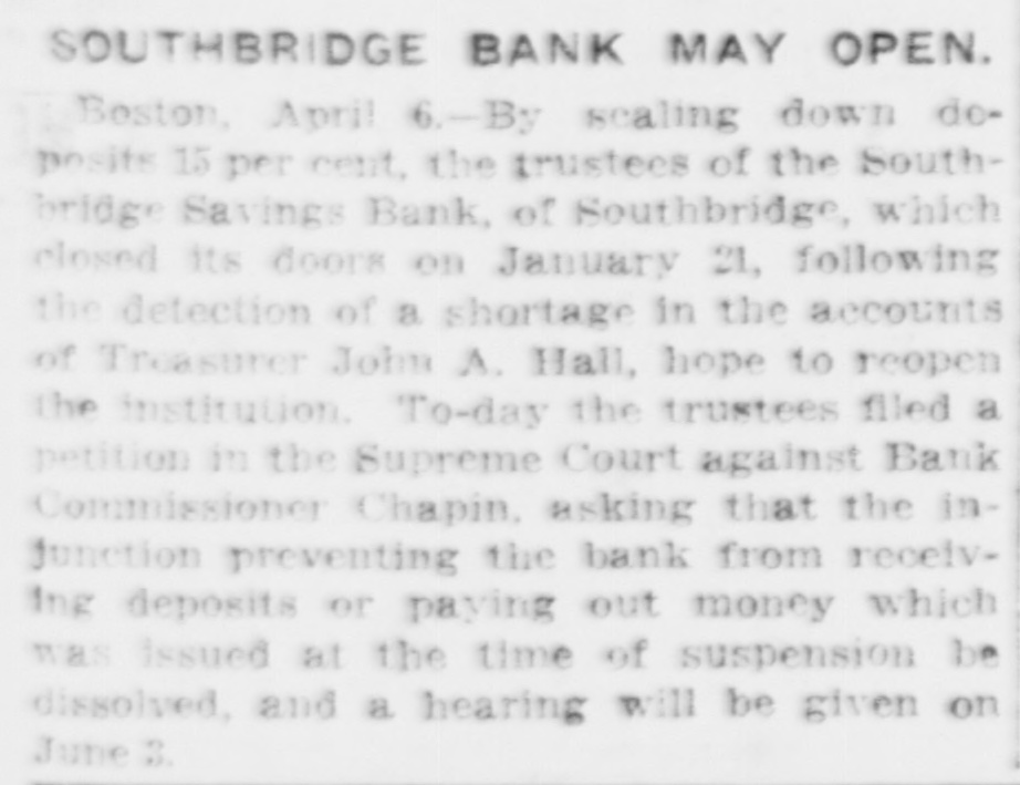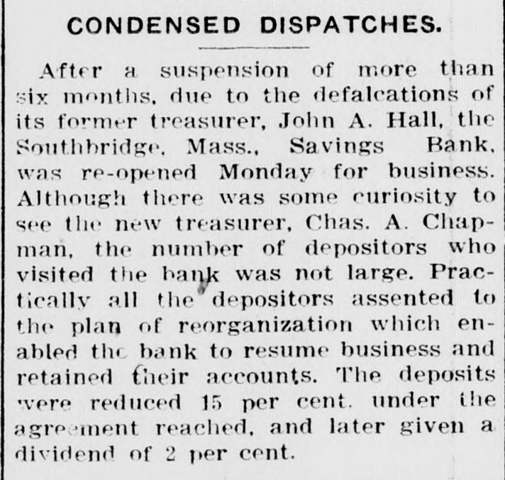 CONDENSED DISPATCHES. After a suspension of more than six months, due to the defalcations of its former treasurer, John A. Hall, the Bank. Southbridge, Mass., Savings was re-opened Monday for business. Although there was some curiosity to see the new treasurer, Chas. A. Chapman, the number of depositors who visited the bank was not large. Practically all the depositors assented to the plan of reorganization which enabled the bank to resume business and retained their accounts. The deposits were reduced 15 per cent. under the agreement reached, and later given a dividend of 2 per cent.