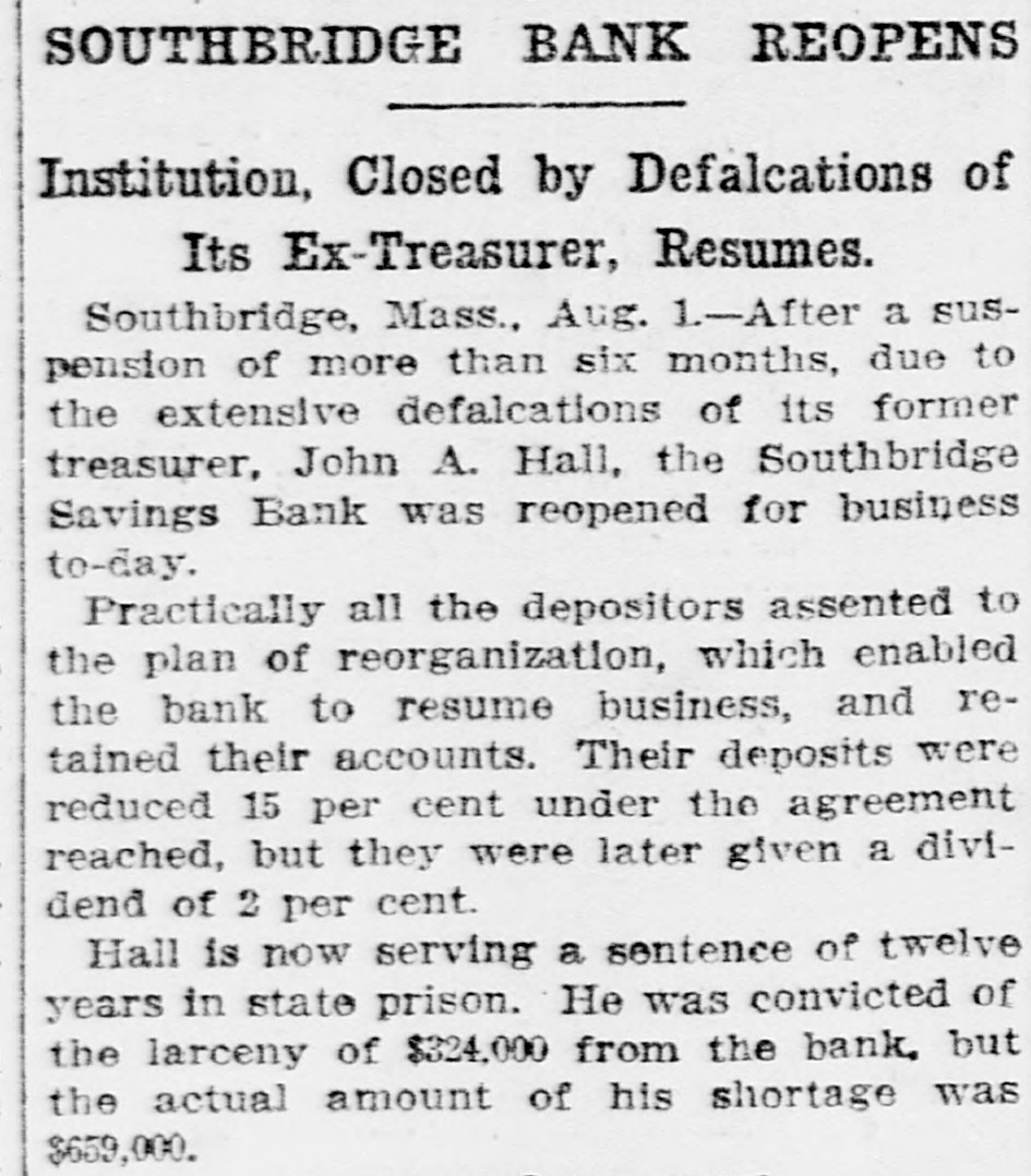 SOUTHBRIDGE BANK REOPENS Institution, Closed by Defalcations of Its Ex-Treasurer, Resumes. Southbridge, Mass., Aug. 1.-After a suspension of more than six months, due to the extensive defalcations of its former treasurer, John A. Hall, the Southbridge Savings Bank was reopened for business to-day. Practically all the depositors assented to the plan of reorganization, which enabled the bank to resume business, and retained their accounts. Their deposits were reduced 15 per cent under the agreement reached, but they were later given a dividend of 2 per cent. Hall is now serving a sentence of twelve years in state prison. He was convicted of the larceny of $324,000 from the bank. but the actual amount of his shortage was $659,000.