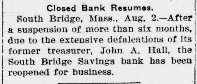 Closed Bank Resumes. South Bridge, Mass., Aug. 2.-After a suspension of more than six months, due to the extensive defalcations of its former treasurer, John A. Hall, the South Bridge Savings bank has been reopened for business.