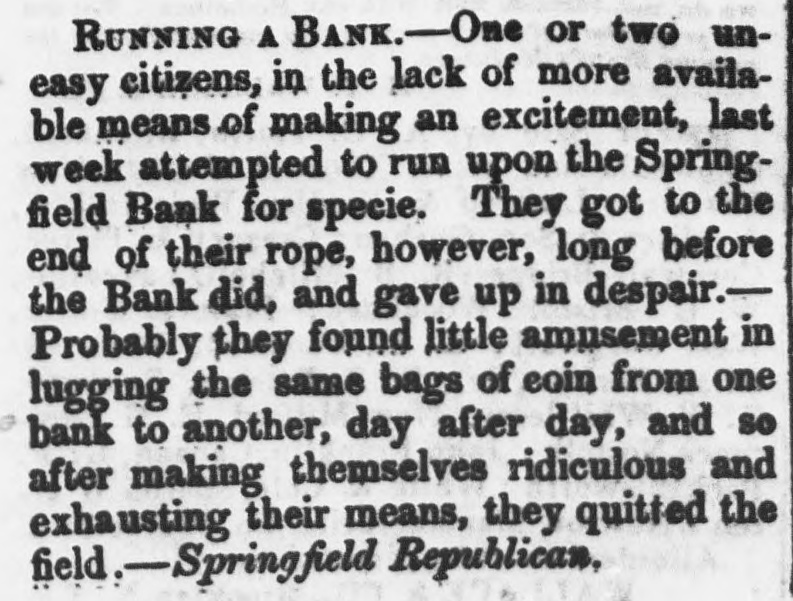 RUNNING A BANK.- - One or two uneasy citizens, in the lack of more available means of making an excitement, last week attempted to run upon the Springfield Bank for specie. They got to the end of their rope, however, long before the Bank did, and gave up in despair.Probably they found little amusement in lugging the same bags of eoin from one bank to another, day after day, and so after making themselves ridiculous and exhausting their means, they quitted the field - -Springfield Republican,