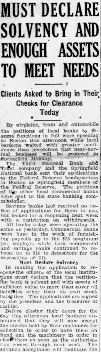 MUST DECLARE SOLVENCY AND ENOUGH ASSETS TO MEET NEEDS Clients Asked to Bring in Their Checks for Clearance Today By airplaine, train and automobile the petitions of local banks to fesume functions in full were to Boston this afternoon while local bankers waited with greater confidence than heretofore that near-normal business will be restored in Springfield The Third National Bank and Trust company and the Springfield National bank sent their applications to the Federal Reserve headquarters in Boston as Springfield members of the Federal Reserve. The petitions of the other local commercial banks were sent to the state banking commissioner. Savings banks had received no notice of for them to use, but looked for reopening next week with restriction on withdrawals. All banks today were operating the same as yesterday. Commercial banks were busy in the work of furnishing payrolls up to the $25 maximum per employe, while both commercial and savings banks to lease up to $10 to depositors for the necessities life. Must Declare Solvency In making the application to reopen,* the officers of the local institutions must declare that the petitionfing bank is solvent and with assets of sufficient value to more than cover all liabilities other than its own stock Habilities. The are signed by the president and the treasurer or cashier. Before closing their doors for the day this afternoon local bankers nounced that they will now accept the checks held by their customers for collection in order to have them on hand and the machinery in order clear them as soon as the authorization comes through next week. The advance acceptance will facilitate the