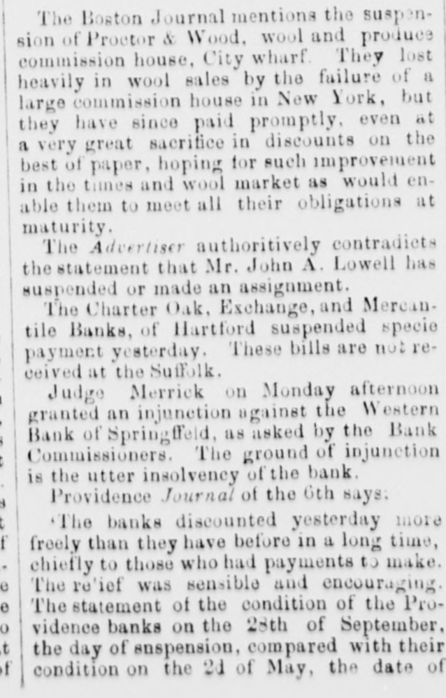 TELEGRAPHIC. 5. Philad liphing Un Much stockholders legislature discovery bonds the extending a individually liable for all the debts of the pany thereafter with provision use of include bonds which may be issued in He bonds alrea dy existing New York, Oct. 6. The screw unship City of from Liverpool noots:28-1 use. arrived here here morning this Great activity prevailed in zland in send ing. reinforce to India. The overland mail stramer Was 10 take 2000 troops from Malta to Alexandria, to be sent through Egy of to India. Several hundred iroops will go out in succeeding steamers. The India Company had decided to engag American and Europeas the fleetent Lord Elgin's mission to Calcutan was to propose exchange of European for native Bengal reg iments, as the Indiana would prove effective and more trustworthy is Cantos than in their own country. Lord Elgin took with him to Calentia 1700 troops, and marines in naral brigade organized to proceed forthwith up the Ganges received dishad Government French The patches from Indian. lag that the Gov ernor of Pondicherry ha called upon the Admiral of the French fleet in the Indian seas. for some ships of war. Gen. Neil at Cawnpere the high caste, or Brahmann, whom be could cap. ture, to collect all the bloody clothes of the victims and was the blood from the floors, their movements being accel rated by the ap plication of cat. Afterwards the Sapoys were hanged one after another. One hundred Austrians offi ers have offered to serve India. London letter in the Puris Patrie asserts that Salif was marching upon Lucknow at the head of 150,000 insurgents and as he was with. in four days of Gen. Havelock was considered certain that he would effect junction with the insurgents before the English General arrived. The Fort of Lucknow was well supplied with provisions and ammu mitious. It was deemed impregnable Advices from St. Petersburg report a great storm and fire on the Sandago Canal. 200 country crafts with their rgoes of produce recked. The following is said to be the result of the new election in Moldavi Out of 87 electors 66 have declared for the union of the Princi palities, against, a neutral. The election at Wallachia is to commence on the 18th. The Persian troops have evacuated Herat. Detroit, Oct. 6. The Farmers & Mechanics Bank, of this city. has been placed under in junction by the Attor ney General Hartford, Oct. 6 The Charter Oak Bank, the Mercantile Bauk and the Exchange Bank, suspended specie pay ment this morning The officers of all the other banks met last night and resolved not to suspend. New York, Oct. 6 Bills of the Lee Bank, Mass, Mercantile Bank Charter Oak Bank, and Exchange Bank, of Conn., and the Bank of W atertown, N.Y. are thrown out to day The Weare Bank N. H. was thrown out. The Bills of the Bank of Lima, N.Y., were again taken. convention, said to be composed of dele gates from the Working Men's Society, assem bled last night and adopte series of resolutions, strongly opposing State Prison Convic Labor, and endorsing the Democratic State Ticket, with the exception of Hiram Denio, Jr in whose place Hiram Ketchum was nominated The work on the sto pendioous Bergeu Tunnel which has for some time been partially stopped, wholly suspended yesterday morning, thus throwing out of employment about eight hun dred men. 6. Oct. Boston, Judge Merrick, on motion of the Bank Com missioners, has granted temporary injunction upon the Western Bank of Sp ringfield, Mase. Harrisburg, Pa Oct. 6. The Legislature courened to-day. Gov. Polmeasures lock delivered his message suggesting for the relief of the banks and public. Buffalo, Oct. 6. opens to-morrow The New York State Pair The entries up and continues for three days. greater number to this noon are over 2.500.than ever before made. The weather very favorable. Boston, Oct. 7 The royal mail steam ship Canada sailed from here at noon to-day, with 27 passengers for She takes out Halifax and 74 for Liverpool. $2,500 in specie. Augusta, Oct. 7 The returns in ddicate the re election to Congress of the Hon. James Seward in the First District. 7. Oct. New York, The attendance at the State Temperance Con vention small only 35 in all. great portion of time was taken up in discussing the merits of the Excise Low which was generally denounce in unmeasured to into enter It determined was terms any entangling alliance with existing parties but to urge prohibition, and the importance of supporting those only on their respective tick ets who were known to oppose the license principle. By the arrival of the City of Wash ington and Fulton there nothing later from India. Messra Harrison. Watson & Co., bank ers of Hull, had with failed large The Emperors of France and Russia met at ult the 27th St Ullgard Mexico accepts the mediation of France and England, and with Spain. The Emperors of Russia Austria were to Weimer on note The Liverpool Provision market sugar market was steady Consols closed 90 @ 901 Troy, Oct. 7 Colonel Richard J. Newelson, resident of Sand Lake in this county, and formerly an ex tensive and wealthy business man in Jersey City, committed suicide while in a fit of tempo rary insanity, at 4 o'clock this a.m. He first cut his throat and then threw himself before train cars on the Hudson Railroad. His body caused has event was dreadfully mangled. The profound sensation here. Harr burg. Oct. T to The Senate has adjourned till afternoon A allow the committees to propar business. bill was presented, authorizing a loan of $100, It occasioning 000 to the State Treasur much excitement, and there many enquiries made as to the necessity of such loan. Toronto, Oct. 7 E. Whitemore & Co., bankers, to-day Much BY mpathy manifested for them in consequence of their high character. 8. Oct. Buffalo, Third day New York State Fair. eather continues fine. It is estimated that there are 50,000 people on the ground to-day. The interest is of the most intease kind, and on the $8,000 had been received at the ticket offic