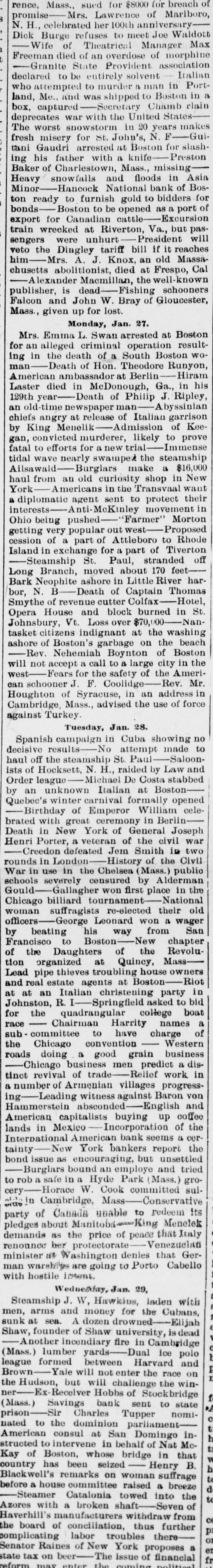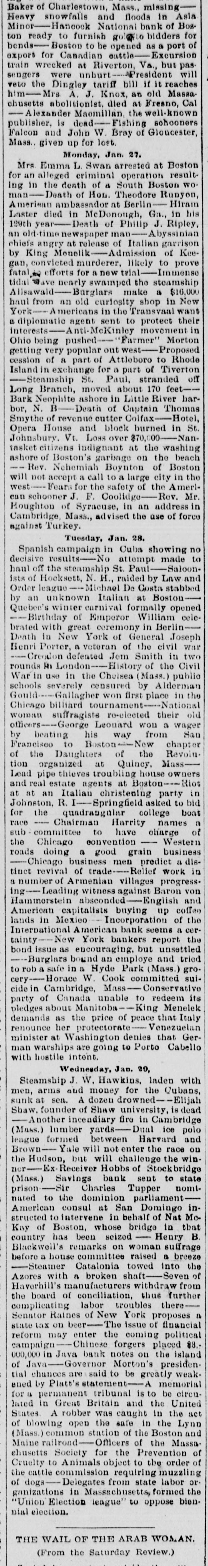 Mrs. Emma L. Swan arrested at Boston for an alleged criminal operation resulting in the death of a South Boston woman-Death of Hon. Theodore Runyon, American ambassador at Berlin-Hiram Laster died in McDonough, Ga., in his 129th year-Death of Philip J. Ripley, an old-time newspaper man-Abyssinian chiefs angry at release of Italian garrison by King Menelik-Admission of Keegan, convicted murderer, likely to prove fatal efforts for a new trial-Immense tidal wave nearly swamped the steamship Ailsawald-Burglars make a $16,000 haul from an old curiosity shop in New York-Americans in the Transvaal want a diplomatic agent sent to protect their interests-Anti-McKinley movement in Ohio being pushed-"Farmer" Morton getting very popular out west-Proposed cession of a part of Attleboro to Rhode Island in exchange for a part of Tiverton-Steamship St. Paul, stranded off Long Branch, moved about 170 feet-Bark Neophite ashore in Little River harbor, N. B-Death of Captain Thomas Smythe of revenue cutter Colfax-Hotel, Opera House and block burned in St. Johnsbury, Vt. Loss over $70,000-Nantasket citizens indignant at the washing ashore of Boston's garbage on the beach-Rev. Nehemiah Boynton of Boston will not accept a call to a large city in the west-Fears for the safety of the American schooner J. F. Coolidge-Rev. Mr. Houghton of Syracuse, in an address in Cambridge, Mass., advised the use of force against Turkey.