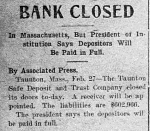 BANK CLOSED In Massachusetts, But President of Institution Says Depositors Will Be Paid in Full. By Associated Press. Taunton, Mass., Feb. 27-The Taunton Safe Deposit and Trust Company closed its doors to-day. A receiver will be ap pointed. The liabilities are $602,966. The president says the depositors will be paid in full.