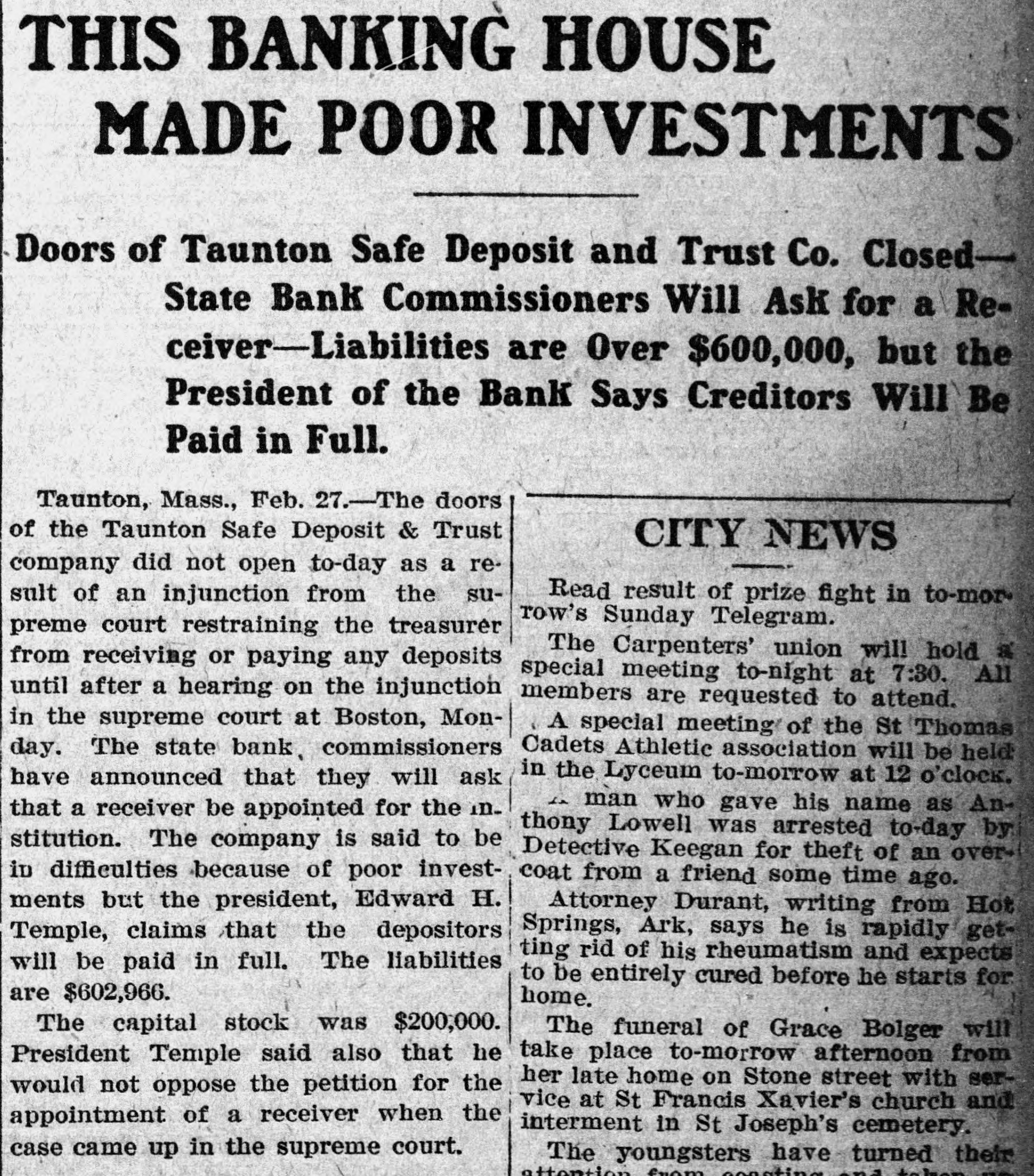 THIS BANKING HOUSE MADE POOR INVESTMENTS Doors of Taunton Safe Deposit and Trust Co. ClosedState Bank Commissioners Will Ask for a Receiver-Liabilities are Over $600,000, but the President of the Bank Says Creditors Will Be Paid in Full. Taunton, Mass., Feb. 27.-The doors of the Taunton Safe Deposit & Trust CITY NEWS company did not open to-day as a reRead result of prize fight in to-mor sult of an injunction from the suTOW'S Sunday Telegram. preme court restraining the treasurer The Carpenters' union will hold from receiving or paying any deposits special meeting to-night at 7:30. All until after a hearing on the injunction members are requested to attend. in the supreme court at Boston, MonA special meeting of the St Thomas Cadets Athletic association will be held day. The state bank, commissioners in the Lyceum to-morrow at 12 o'clock. have announced that they will ask man who gave his name as Anthat a receiver be appointed for the in. thony Lowell was arrested to-day by stitution. The company is said to be Detective Keegan for theft of an over+ in difficulties because of poor investcoat from a friend some time ago. ments but the president, Edward H. Attorney Durant, writing from Hot Springs, Ark, says he is rapidly getTemple, claims that the depositors ting rid of his rheumatism and expects will be paid in full. The liabilities to be entirely cured before he starts for are $602,966. home. The capital stock was $200,000. The funeral of Grace Bolger will take place to-morrow afternoon from President Temple said also that he her late home on Stone street with serwould not oppose the petition for the vice at St Francis Xavier's church and appointment of a receiver when the interment in St Joseph's cemetery. case came up in the supreme court. The youngsters have turned their