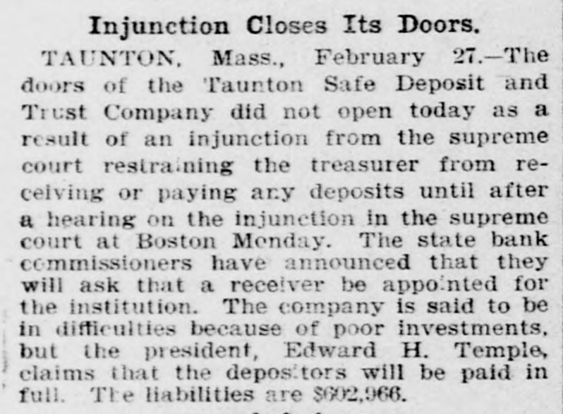 Injunction Closes Its Doors. TAUNTON, Mass., February 27.-The doors of the Taunton Safe Deposit and Trust Company did not open today as a result of an injunction from the supreme court restraining the treasurer from receiving or paying any deposits until after a hearing on the injunction in the supreme court at Boston Monday. The state bank commissioners have announced that they will ask that a receiver be appointed for the institution. The company is said to be in difficulties because of poor investments, but the president, Edward H. Temple, claims that the depositors will be paid in full. The liabilities are $602,966.