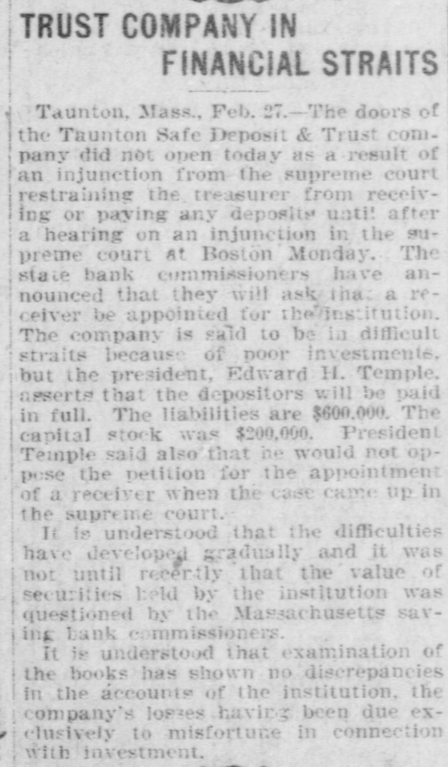 DOORS DIDN'T OPEN. Taunton Trust Company Is in Difficulties. Taunton, Mass., Feb. 27.-The doors of the Taunton Safe Deposit & Trust company. did not open today as a result of an injunction from the supreme court restraining the treasurer from receiving or paying any deposits until after a hearing on an injunction in the supreme court at Boston Monday. The state bank commissioners have announced that they will ask that a receiver be appointed for the institution. The company is said to be in difficulties because of poor investments, but the president, Edward H. Temple, asserts that the depositors will be paid in full. The liabilities are $600,000. The capital stock was $200,000. President Temple said also that he would not oppose the petition for the appointment of a receiver when the case came up in the supreme court.