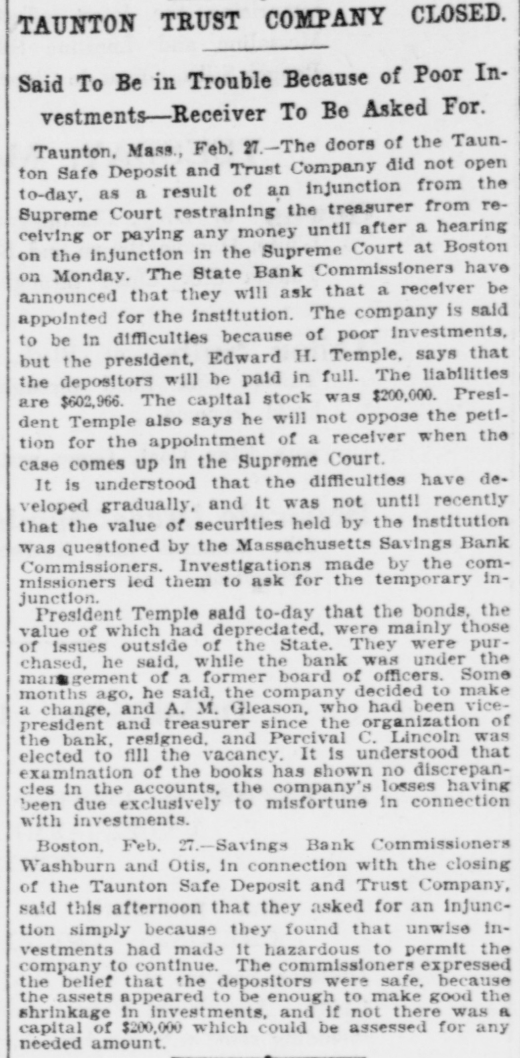 TAUNTON TRUST COMPANY CLOSED. Said To Be in Trouble Because of Poor Investments-Receiver To Be Asked For. Taunton, Mass., Feb. 27.-The doors of the Taunton Safe Deposit and Trust Company did not open to-day, as a result of an injunction from the Supreme Court restraining the treasurer from receiving or paying any money until after a hearing on the injunction in the Supreme Court at Boston on Monday. The State Bank Commissioners have announced that they will ask that a receiver be appointed for the institution. The company is said to be in difficulties because of poor Investments, but the president, Edward H. Temple, says that the depositors will be paid in full. The liabilities are $602,966. The capital stock was $200,000. President Temple also says he will not oppose the petition for the appointment of a receiver when the case comes up in the Supreme Court. It is understood that the difficulties have developed gradually, and it was not until recently that the value of securities held by the institution was questioned by the Massachusetts Savings Bank Commissioners. Investigations made by the commissioners led them to ask for the temporary injunction. President Temple said to-day that the bonds, the value of which had depreciated, were mainly those of issues outside of the State. They were purchased, he said, while the bank was under the man gement of a former board of officers. Some months ago, he said, the company decided to make a change, and A. M. Gleason, who had been vicepresident and treasurer since the organization of the bank, resigned, and Percival C. Lincoln was elected to fill the vacancy. It is understood that examination of the books has shown no discrepancles in the accounts, the company's losses having been due exclusively to misfortune in connection with investments. Boston. Feb. 27.-Savings Bank Commissioners Washburn and Otis, in connection with the closing of the Taunton Safe Deposit and Trust Company, said this afternoon that they asked for an injunction simply because they found that unwise investments had made It hazardous to permit the company to continue. The commissioners expressed the belief that the depositors were safe, because the assets appeared to be enough to make good the shrinkage in investments, and if not there was & capital of $200,000 which could be assessed for any needed amount.