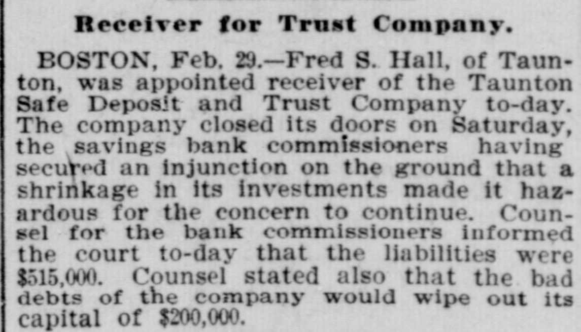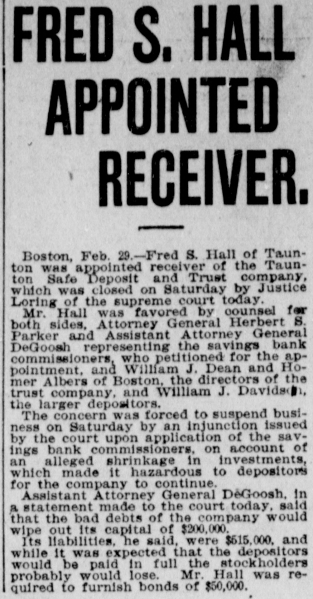FRED S. HALL APPOINTED RECEIVER. Boston, Feb. 29.-Fred S. Hall of Taunton was appointed receiver of the Taunton Safe Deposit and Trust company, which was closed on Saturday by Justice Loring of the supreme court today. Mr. Hall was favored by counsel for both sides, Attorney General Herbert S. Parker and Assistant Attorney General DeGoosh representing the savings bank commissioners, who petitioned for the appointment, and William J. Dean and Homer Albers of Boston, the directors of the trust company, and William J. Davids the larger depositors. The concern was forced to suspend business on Saturday by an injunction issued by the court upon application of the savings bank commissioners, on account of an alleged shrinkage in investments, which made it hazardous to depositors for the company to continue. Assistant Attorney General DeGoosh, in a statement made to the court today, said that the bad debts of the company would wipe out its capital of $200,000. Its liabilities, he said, were $515,000, and while it was expected that the depositors would be paid in full the stockholders probably would lose. Mr. Hall was required to furnish bonds of $50,000.
