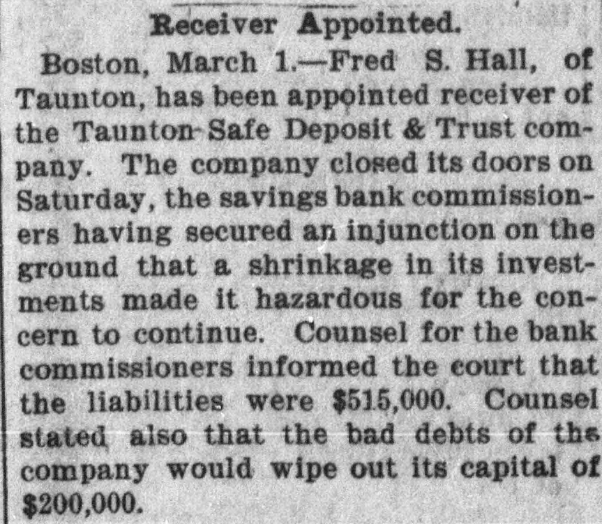 Receiver Appointed. Boston, March 1.-Fred S. Hall, of Taunton, has been appointed receiver of the Taunton-Safe Deposit & Trust company. The company closed its doors on Saturday, the savings bank commissioners having secured an injunction on the ground that a shrinkage in its investments made it hazardous for the concern to continue. Counsel for the bank commissioners informed the court that the liabilities were $515,000. Counsel stated also that the bad debts of the company would wipe out its capital of $200,000.