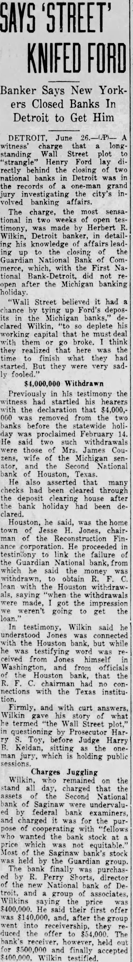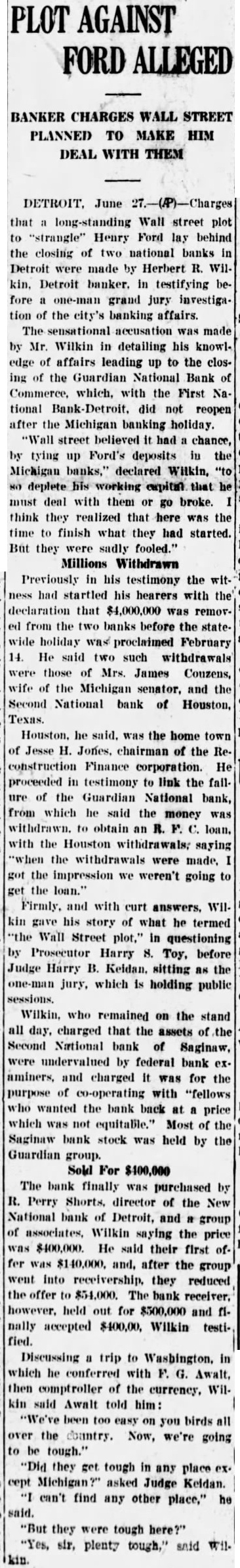 Firmly, and with curt answers, Wilkins gave his story of what he termed "the Wall Street plot,' in questioning by Prosecutor Harry S. Toy, before Judge Harry S. Keidan, sitting as the one-man jury, which is holding public sessions, Wilkin, who remained on the stand all day, charged that the assets of the Second National Bank of Saginaw were under-valued by federal bank examiners, and charged it was for the pupose of cooperating with "fellows who wanted the bank back at a price which was not equitable." Most of Saginaw bank's stock was held by the Guardian group. The bank finally was purchased by R. Perry Shorts, director of the new National Bank of Detroit, and a group of associates, Wilkin saying the price was $400,000. He said their first offer was $140,000, and, after the group went into ership, they reduced the offer to $54,000. The bank's receiver, however, held out for $500,000 and finally accepted $400,000. Wilkin testified. Discussing trip to Washington, in which he conferred with G. Awalt, then comptroller of the currency, Wilkin said Awalt told him: "We've been too easy on you birds all over the country. Now, going to be tough." "Did they get tough in any place except Michigan," asked Judge Keidan. "I can't find any other place," he said. "But they were tough here "Yes, sir, plenty tough," said Mayor Frank Couzens, son of Senator and Mrs. Couzens, said this afternoon that "Mr. Wilkin's testimony, if it has been reported to me correctly, reveals that he is in possession of only a part of the facts." Senator Couzens in London as a delegate to the world economic conference and Mrs. Couzens is with him. "Certainly," Mayor Couzens continued, "no funds were transferred from the National Bank of Commerce or any other bank with any knowledge that a banking holiday would take place." He said that while his father's family was living in Washington, "the Detroit Trust Company was used to collect monies from coupons and each month the collected funds were transferred through the National Bank of Commerce to the Riggs National Bank in Washington. This had been the custom over a period of several years." The mayor added that "I certainly do not know what was behind his (Wilkin's) statement."