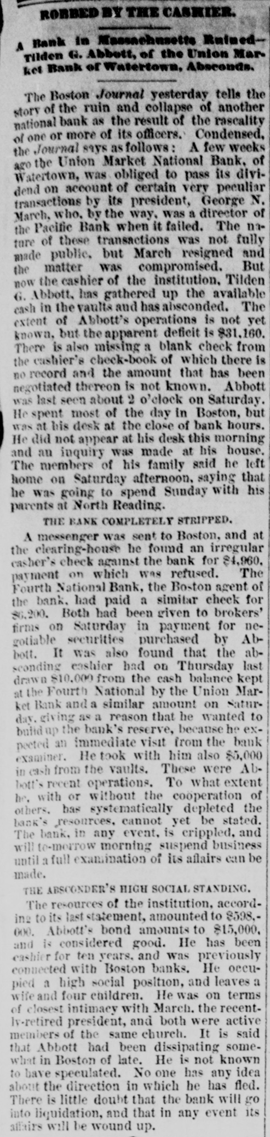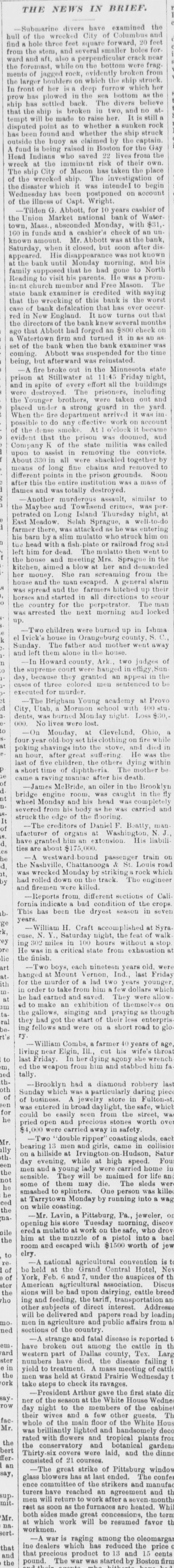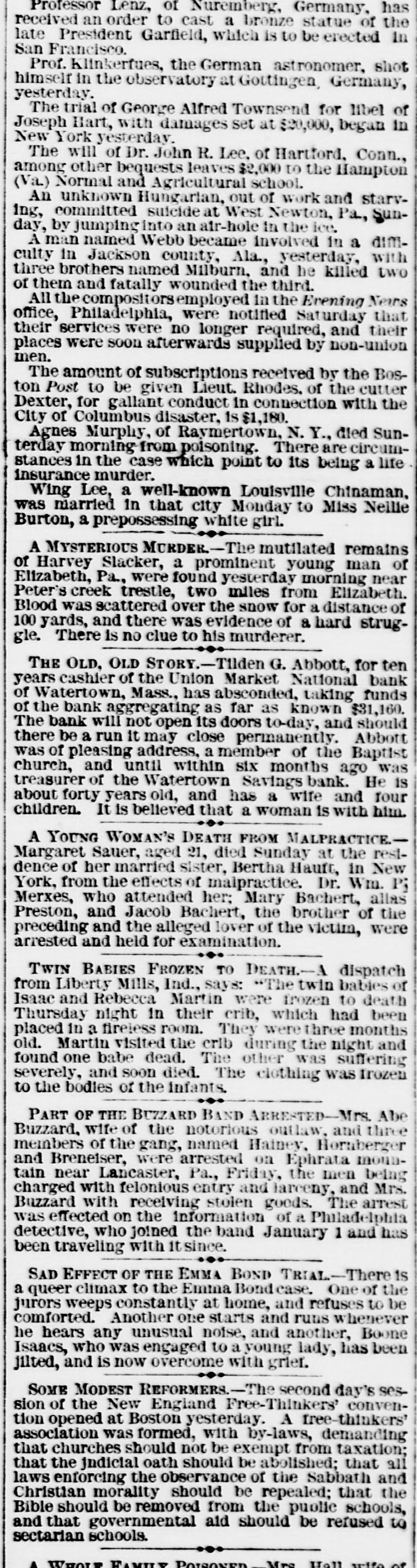 Professor Lenz, of Nuremberg, Germany, has received an order to cast a bronze statue of the late President Garfield, which is to be erected In San Francisco. Prof. Klinkerfues, the German astronomer, shot himself in the observatory at Gottingen, Germany, yesterday. The trial of George Alfred Townsend for libel of Joseph Hart, with damages set at $20,000, began in New York yesterday. The will of Dr. John R. Lee, of Hartford, Conn., among other bequests leaves $2,000 to the Hampton (Va.) Normal and Agricultural school. An unknown Hungarian, out of work and starving, committed suicide at West Newton, Pa, Sunday, by jumping in an air-hole in the ice. A man named Webb became involved in a dimculty in Jackson county, Ala., yesterday, with three brothers named Milburn, and he killed two of them and fatally wounded the third. All the compositorsemployed in the Evening News office, Philadelphia, were notified Saturday that their services were no longer required, and their places were soon afterwards supplied by non-union men. The amount of subscriptions received by the Boston Post to be given Lieut. Rhodes. of the cutter Dexter, for gallant conduct in connection with the City of Columbus disaster, is $1,180. Agnes Murphy, of Raymertown, N. Y., died Sunterday morning from poisoning. There are circumstances in the case which point to its being a life insurance murder. Wing Lee, a well-known Louisville Chinaman, was married in that city Monday to Miss Neille Burton, a prepossessing white girl. A MYSTERIOUS MURDER-The mutilated remains of Harvey Slacker, a prominent young man of Elizabeth, Pa., were found yesterday morning near Peter's creek trestle, two miles from Elizabeth. Blood was scattered over the snow for a distance of 100 yards, and there was evidence of a hard struggle. There is no clue to his murderer. ... THE OLD, OLD STORY.-Tilden G. Abbott, for ten years cashier of the Union Market National bank of Watertown, Mass., has absconded, taking funds of the bank aggregating as far as known $31,160. The bank will not open its doors to-day, and should there be a run it may close permanently. Abbott was of pleasing address, a member of the Baptist church, and until within six months ago was treasurer of the Watertown Savings bank. He is about forty years old, and has a wife and four children. It is believed that a woman is with him. A YOUNG WOMAN'S DEATH FROM MALPRACTICEMargaret Sauer, aged 21, died Sunday at the restdence of her married sister, Bertha Hauft, in New York, from the effects of malpractice. Dr. Wm. P; Merxes, who attended her; Mary Bachert, allas Preston, and Jacob Bachert, the brother of the preceding and the alleged lover of the victim, were arrested and held for examination. TWIN BABIES FROZEN TO DEATH.-A dispatch from Liberty Mills, Ind., says: "The twin babies or Isaac and Rebecca Martin were frozen to death Thursday night in their crib, which had been placed in a fireless room. They werethree months old. Martin visited the crib during the night and found one babe dead. The other was suffering severely, and soon died. The clothing was trozen to the bodies of the infants. PART OF THE BUZZARD BAND ARRESTED-Mrs. Abc Buzzard, wife of the notorious outlaw. and three members of the gang, named Hainey, Hornberger and Breneiser, were arrested on Ephrata mountain near Lancaster, Pa., Friday, the men being charged with felonious entry and larceny, and Mrs. Buzzard with receiving stolen goods. The arrest was effected on the information of a Philadelphia detective, who joined the band January 1 and has been traveling with it since. SAD EFFECT OF THE EMMA BOND TRIAL-There is a queer climax to the Emma Bond case. One of the jurors weeps constantly at home, and refuses to be comforted. Another one starts and runs whenever he hears any unusual noise, and another, Boone Isaacs, who was engaged to a young lady, has been jilted, and is now overcome with grief. SOME MODEST REFORMERS.-The second day's session of the New England Free-Thinkers' convention opened at Boston yesterday. A tree-thinkers' association was formed, with by-laws, demanding that churches should not be exempt from taxation; that the jndicial oath should be abolished; that all laws enforcing the observance of the Sabbath and Christian morality should be repealed; that the Bible should be removed from the puolic schools, and that governmental aid should be refused to sectarian schools. WHOLE FAVILY PATIONED wife of