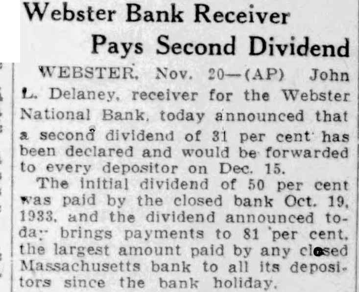 Webster Bank Receiver Pays Second Dividend WEBSTER. Nov. 20-(AP) John L. Delaney. receiver for the Webster National Bank, today announced that second dividend of 31 per cent has been would be forwarded to every depositor on Dec. 15. The initial dividend of 50 per cent was paid by the closed bank Oct 19. 1933. and the dividend announced toda: brings payments to 81 per cent. the largest amount paid by any closed bank to its depositors since the bank holiday
