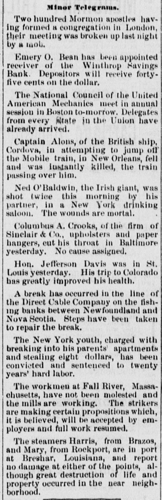 Minor Telegrams. Two hundred Mormon apostles having formed a congregation in London, their meeting was broken up last night by a mob. Emery O. Bean has been appointed receiver of the Winthrop Savings Bank. Depositors will receive forty-five cents on the dollar. The National Council of the United American Mechanics meet in annual session in Boston to-morrow. Delegates from every state in the Union have already arrived. Captain Alons, of the British ship, Cordova, in attempting to jump off the Mobile train, in New Orleans, fell and was instantly killed, the train passing over him. Ned O'Baldwin, the Irish giant, was shot twice this morning by his partner, in a New York drinking saloon. The wounds are mortal. Columbus A. Crooks, of the firm of Sinclair & Co., upholsters and paper hangers, cut his throat in Baltimore yesterday. No cause assigned. Hon. Jefferson Davis was in St. Louis yesterday. His trip to Colorado has greatly improved his health. A break has occurred in the line of the Direct Cable Company on the fishing banks between Newfoundland and Nova Scotia. Steps have been taken to repair the break. The New York youth, charged with breaking into his parents' apartments and stealing eight dollars, has been convicted and sentenced to twenty years' hard labor. The workmen at Fall River, Massachusetts, have not been molested and the mills are working. The strikers are making certain propositions which, it is believed, will be accepted by employers and full work resumed. The steamers Harris, from Brazos, and Mary, from Rockport, are in port at Breshar, Louisiana, and report no damage at either of the points, although great destruction of life and property occurred in the near neighborhood.