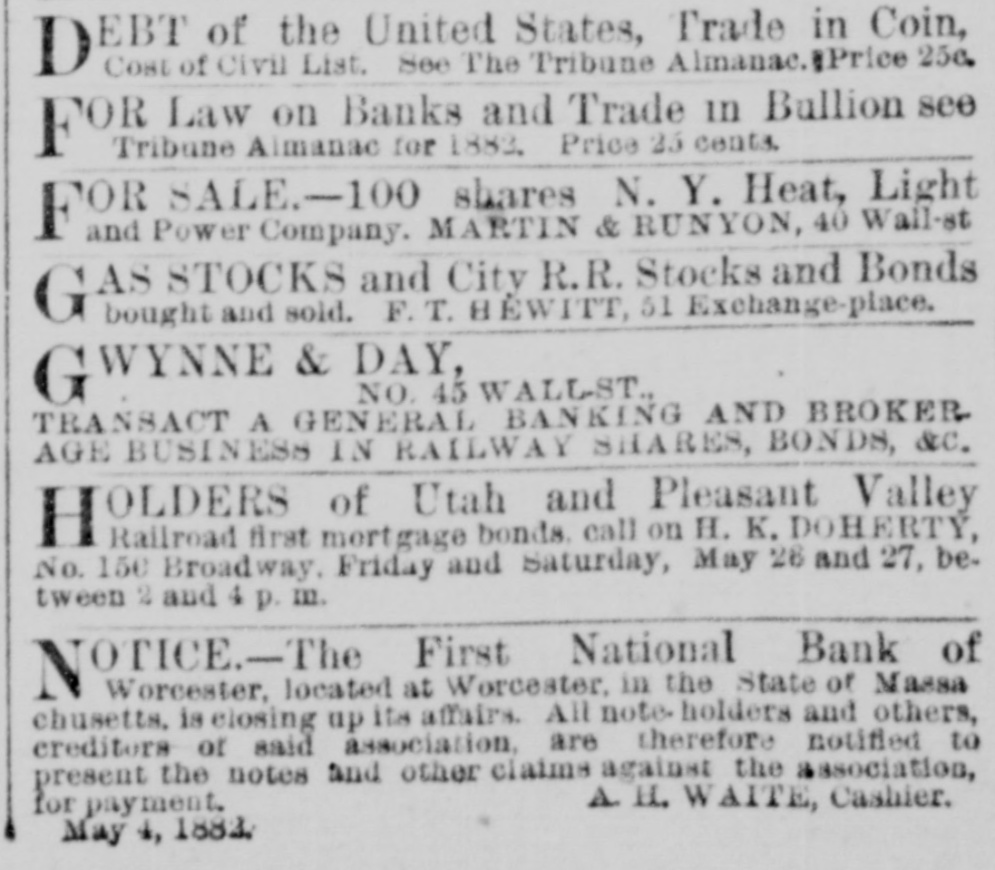 EBT of the United States, Trade in Coin, Cost of Civil List. See The Tribune Almanac. Price 25c. D on Banks and Trade in Bullion see Almanac for 1883. Price 25 cents. FORLAW SALE.-100 shares N. Y. Heat, Light FOR and Power Company. MARTIN & RUNYON, 40 Wall-st AS STOCKS and City R. R. Stocks and Bonds bought and sold. F. T. BÉWITT, 51 Exchange-place. WYNNE & DAY, NO. 45 WALLST. TRANSACT A GENERAL BANKING AND BROKER AGE BUSINESS IN RAILWAY SHARES, BONDS, &C. HOLDERS of Utah and Pleasant Valley Railroad first mortgage bonds call on H. K. DOHERTY, No. 150 Broadway. Friday and Saturday, May 26 and 27, between 2 and 4 p. m. NOTICE.-The First National Bank of Worcester, located at Worcester, in the State of Massa chusetts. is closing up its affairs. All note holders and others, creditors of said association. are therefore notified to present the notes and other claims against the association, A H. WAITE, Cashier. for payment. May 4, 1882