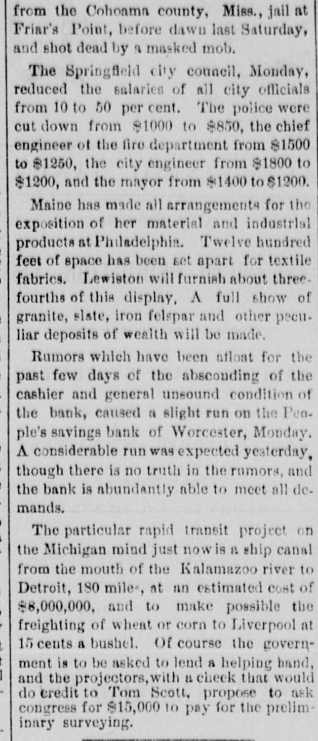 from the Cohoama county, Miss., jail at Friar's Point, before dawn last Saturday, and shot dead by 8 masked mob. The Springfield city council, Monday, reduced the salaries of all city officials from 10 to 50 per cent. The police were cut down from $1000 to $850, the chief engineer of the fire department from $1500 to $1250, the city engineer from $1800 to $1200, and the mayor from $1400 to $1200. Maine has made all arrangements for the exposition of her material and industrial products at Philadelphia. Twelve hundred feet of space has been set apart for textile fabrics. Lewiston will furnish about threefourths of this display. A full show of granite, slate, iron felspar and other peculiar deposits of wealth will be made. Rumors which have been afloat for the past few days of the absconding of the cashier and general unsound condition of the bank, caused a slight run on the People's savings bank of Worcester, Monday. A considerable run was expected yesterday, though there is no truth in the rumors, and the bank is abundantly able to meet all demands. The particular rapid transit project on the Michigan mind just now is a ship canal from the mouth of the Kalamazoo river to Detroit, 180 miles, at an estimated cost of $8,000,000, and to make possible the freighting of wheat or corn to Liverpool at 15 cents a bushel. Of course the government is to be asked to lend a helping hand, and the projectors, with a cheek that would do credit to Tom Scott. propose to ask congress for $15,000 to pay for the preliminary surveying.