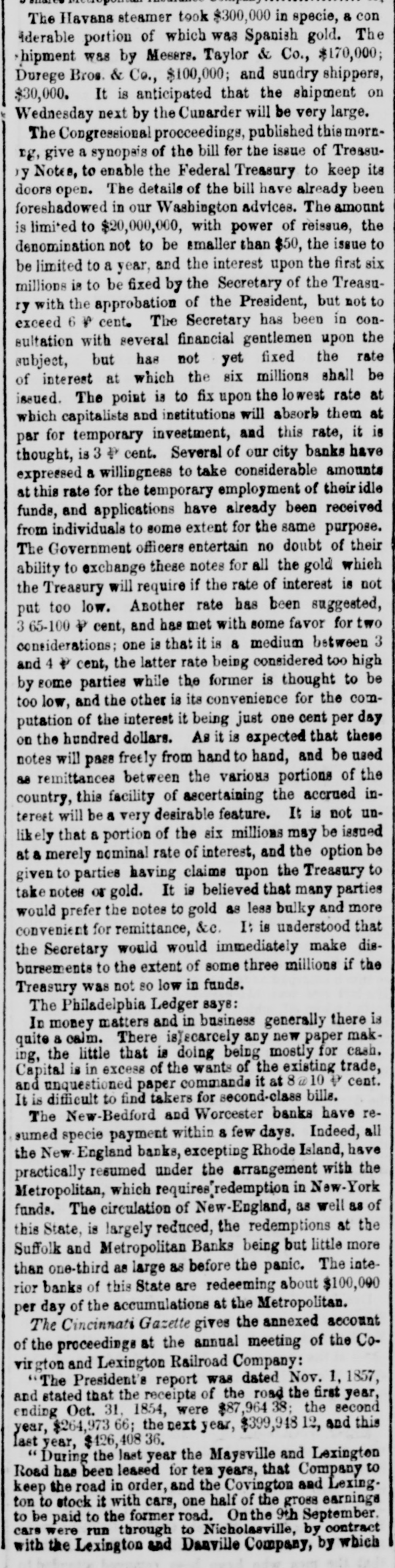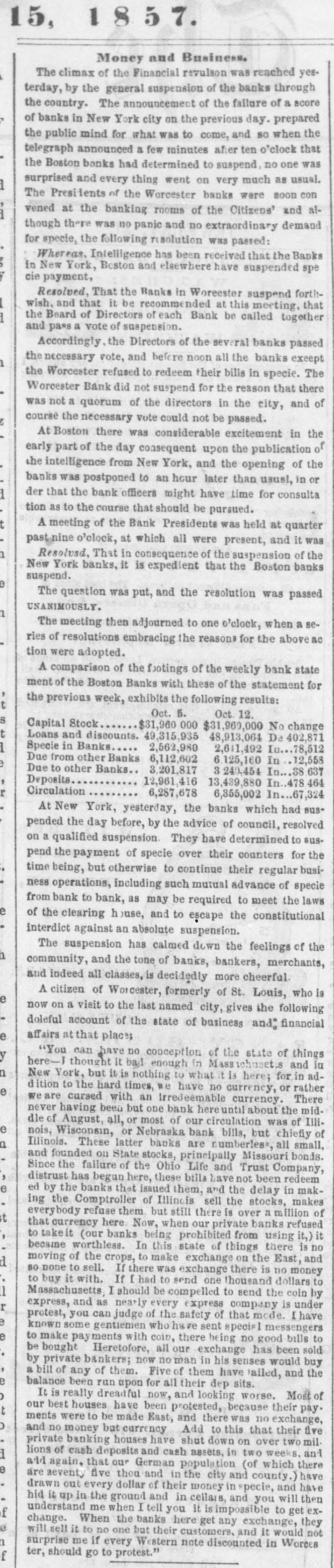 Money and Business. The climax of the Financial revulson was reached yesterday, by the general suspension of the banks through the country. The announcement of the failure of a score of banks in New York city on the previous day. prepared the public mind for what was to come, and so when the telegraph announced a few minutes after ten o'clock that the Boston bonks had determined to suspend, no one was surprised and every thing went on very much as usual. The Presidents of the Worcester banks were soon con vened at the banking rooms of the Citizens' and although there was no panic and no extraordinary demand for specie, the following resolution was passed: Whereas, Intelligence has been received that the Banks in New York, Boston and elsewbere have suspended spe cie payment, Resolved, That the Banks in Woreester suspend forthwish, and that it be recommended at this meeting, that the Beard of Directors of each Bank be called together and pass a vote of suspension. Accordingly. the Directors of the several banks passed the necessary vote, and before noon all the banks except the Worcester refused to redeem their bills in specie. The Worcester Bank did not suspend for the reason that there was not a quorum of the directors in the city, and of course the necessary vote could not be passed. At Boston there was considerable excitement in the early part of the day consequent upon the publication of the intelligence from New York, and the opening of the banks was postponed to an hour later than ususl, in or der that the bank officers might have time for consulta tion as to the course that should be pursued. A meeting of the Bank Presidents was held at quarter past nine o'clock, at which all were present, and it was Resolusd, That in consequence of the suspension of the New York banks, it is expedient that the Boston banks suspend. The question was put, and the resolution was passed UNANIMOUSLY. The meeting then adjourned to one o'clock, when a series of resolutions embracing the reasons for the above ac tion were adopted. A comparison of the footings of the weekly bank state ment of the Boston Banks with these of the statement for the previous week, exhibits the following results: Oct. 5. Oct. 12. Capital Stock $31,960 000 $31,960,000 No change Loans and discounts. 49,315,935 De 48,913,064 402,871 Specie in Banks 2,562,980 In 2,641,492 78,512 Due from other Banks 6,112,602 In 12,558 6.125,160 Due to other Banks 3,201,817 3 240,454 In 38.637 Deposits 12,961,416 In 478 464 13,489,880 Circulation 6,287,678 In 6,355,002 67,324 At New York, yesterday, the banks which had suspended the day before, by the advice of council, resolved on a qualified suspension. They have determined to auspend the payment of specie over their counters for the time being, but otherwise to continue their regular business operations, including such mutual advance of specie from bank to bank, as may be required to meet the laws of the clearing h buse, and to escape the constitutional interdict against an absolute suspension. The suspension has calmed down the feelings of the community, and the tone of banks, bankers, merchants, and indeed all classes, is decidedly more cheerful. A citizen of Worcester, formerly of St. Louis, who is now on a visit to the last named city, gives the following doleful account of the state of business and: financial affairs at that place; "You can have no conception of the state of things here-I thought it bad. enough in Massuchuget: and in