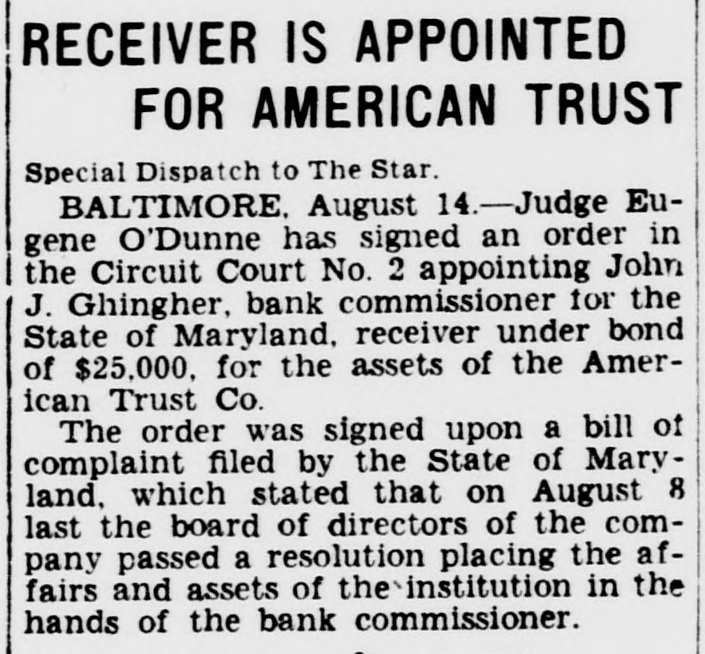 RECEIVER IS APPOINTED FOR AMERICAN TRUST Special Dispatch to The Star. BALTIMORE, August 14.-Judge Eugene O'Dunne has signed an order in the Circuit Court No. 2 appointing John J. Ghingher, bank commissioner for the State of Maryland, receiver under bond of $25,000, for the assets of the American Trust Co. The order was signed upon a bill of complaint filed by the State of Maryland, which stated that on August 8 last the board of directors of the company passed a resolution placing the affairs and assets of the institution in the hands of the bank commissioner.