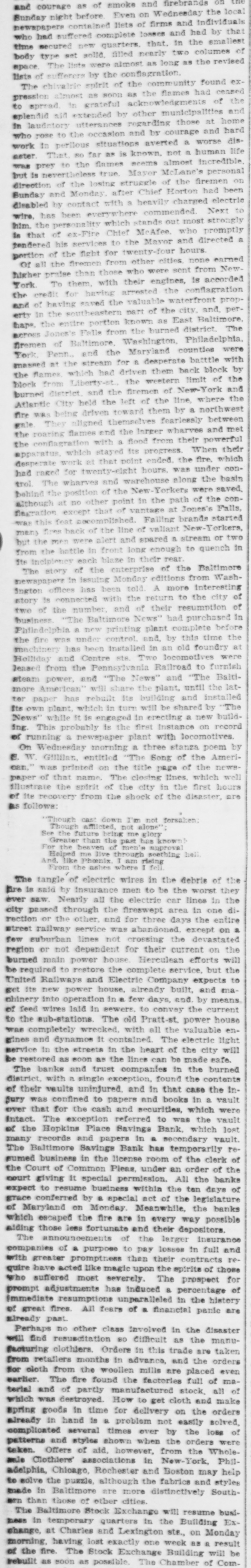 and courage as of smoke and firebrands Bunday night before Even on Wednesday the local newspapers contained lists of firms and individuals who had suffered complete losses and had by that time secured new quarters that. in the smallest body type set solld. filled nearly two columes of space The lists were almost as long as the revised lists of sufferers by the conflagration The chivairic spirit of the community found ex. pression almost as soon as the flames had ceased to spread in grateful acknowledgments of the splendid all extended by other municipalities and in laudetory utterances regarding those at home who rose to the occasion and by courage and hard work in perilous situations averted a worse disaster That so far as is known. not a human life was prey to the finmes seems almost incredible but is nevertheless true Mayor McLane's personal direction of the losing struggle of the firemen on Bunday and Monday after Chief Horton had been disabled by contact with a heavily charged electric wire. has been everywhere commended Next to Inim. the personality which stands out most strongly in that of ex-Fire Chief McAfee who promptly tendered his services to the Mayor and directed a portion of the fight for twenty-four hours or all the firemen from other cities none earned higher praise than those who were sent from NewYork To them with their engines, is accorded the credit for having arrested the conflagration and of having saved the valuable waterfront property in the southeastern part of the city and perhape the entire portion known as East Baltimore, across Jones's Falls from the burned district The firemen of Baltimore Washington Philadelphia, York Penn. and the Maryland counties were massed at the stream for a desperate batttle with the flames which had driven them back block by block from Liberty-st the western limit of the burned district and the firemen of New-York and Atlantic City held the left of the line, where the fire WRS being driven toward them by a northwest gale They aligned themselves fearlessly between the roaring flames and the larger wharves and met the conflagration with a flood from their powerful apparatus which stayed its progress When their desperate work at that point ended the fire. which had raked for twenty-eight hours. was under control The wharves and warehouse along the basin behind the position of the New-Yorkers were saved, although at no other point in the path of the conflagration except that of vantage at Jones's Falls, was this feat accomplished. Falling brands started many fires back of the line of vallant New-Yorkers, but the men were alert and spared a stream or two from the hattle in front long enough to quench in Its incipiency each blaze in their rear The story of the enterprise of the Baltimore newspapers in issuing Monday editions from Washington offices has been told A more interesting story is connected with the return to the city of two of the number and of their resumption of business "The Baltimore News' had purchased in Philadelphia a new printing plant complete before the fire was under control and, by this time the machinery has been installed in an old foundry at Holliday and Centre sts. Two locomotives were leased from the Pennsylvania Railroad to furnish steam power and "The News" and "The Baltimore American' will share the plant, until the latter paper has rebuilt its building and installed Its own plant, which in turn will be shared by "The News" while It is engaged in erecting a new buildfing. This probably is the first Instance on record of running a newspaper plant with locomotives. On Wednesday morning a three stanza poem by e W Gillilan, entitled "The Song of the American,' was printed on the title page of the newspaper of that name. The closing lines, which well illustrate the spirit of the city in the first hours of its recovery from the shock of the disaster, are as follows: "Though cast down I'm not forsaken: Though afflicted not alone" See the future bring me glory Greater than the past has known! For the heaven of men's approval Helped me live through seething hell And. like Phoenix am rising From the ashes where fell The tangle of electric wires in the debris of the fire is said by insurance men to be the worst they ever saw Nearly all the electric car lines in the city passed through the fireswept area in one direction or the other and for three days the entire street railway service was abandoned except on a few suburban lines not crossing the devastated region or not dependent for their current on the burned main power house Herculean efforts will the required to restore the complete service, but the United Railways and Electric Company expects to get its new power house, already built, and ma ohinery into operation in 8. few days, and by means of feed wires laid In sewers to convey the current to the sub-stations. The old Pratt-st. power house was completely wrecked. with all the valuable engines and dynamos It contained. The electric light service in the streets in the heart of the city will be restored as soon as the lines can be made safe. The banks and trust companies in the burned district with a single exception, found the contents of their vaults uninjured and in that case the Injury was confined to papers and books in a vault over that for the cash and securities, which were Intact. The exception referred to was the vault of the Hopkins Place Savings Bank, which lost many records and papers in a secondary vault. The Baltimore Savings Bank has temporarily resumed business in the license room of the clerk of the Court of Common Pleas, under an order of the court giving It special permission. All the banks expect to resume business within the ten days of grace conferred by a special act of the legislature of Maryland on Monday Meanwhile, the banks which escaped the fire are in every way possible aiding those less fortunate and their depositors. The announcements of the larger insurance companies of a purpose t