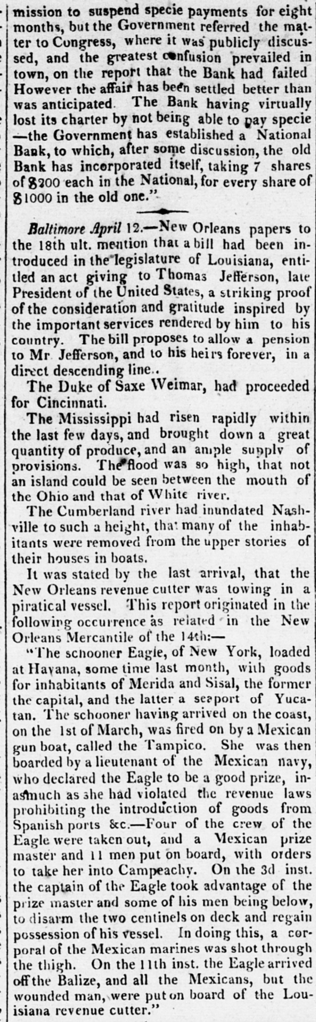 mission to suspend specie payments for eight months, but the Government referred the matter to Congress, where it was publicly discussed, and the greatest confusion prevailed in town, on the report that the Bank had failed However the affair has been settled better than was anticipated. The Bank having virtually lost its charter by not being able to pay specie -the Government has established a National Bank, to which, after some discussion, the old Bank has incorporated itself, taking 7 shares of $200 each in the National, for every share of $1000 in the old one." Baltimore April 12.-New Orleans papers to the 18th ult. mention that a bill had been introduced in the "legislature of Louisiana, entitled an act giving to Thomas Jefferson, late President of the United States, a striking proof of the consideration and gratitude inspired by the important services rendered by him to his country. The bill proposes to allow a pension to Mr. Jefferson, and to his heirs forever, in a direct descending line.. The Duke of Saxe Weimar, had proceeded for Cincinnati. The Mississippi had risen rapidly within the last few days, and brought down a great quantity of produce, and an ample supply of provisions. The flood was so high, that not an island could be seen between the mouth of the Ohio and that of White river. The Cumberland river had inundated Nashville to such a height, that many of the inhabitants were removed from the upper stories of their houses in boats. It was stated by the last arrival, that the New Orleans revenue cutter was towing in a piratical vessel. This report originated in the following occurrence as related in the New Orleans Mercantile of the 14th:"The schooner Eagle, of New York, loaded at Hayana, some time last month, with goods for inhabitants of Merida and Sisal, the former the capital, and the latter a seaport of Yucatan. The schooner having arrived on the coast, on the 1st of March, was fired on by a Mexican gun boat, called the Tampico. She was then boarded by a lieutenant of the Mexican navy, who declared the Eagle to be a good prize, inasmuch as she had violated the revenue laws the crew prohibiting Spanish ports &c.-Four introduction of the of goods of from the Eagle were taken out, and a Mexican prize master and 11 men put on board, with orders to take her into Campeachy. On the 3d inst. the captain of the Eagle took advantage of the prize master and some of his men being below, to disarm the two centinels on deck and regain possession of his vessel. In doing this, a corporal of the Mexican marines was shot through the thigh. On the 11th inst. the Eagle arrived off the Balize, and all the Mexicans, but the wounded man, were put on board of the Louisiana revenue cutter."