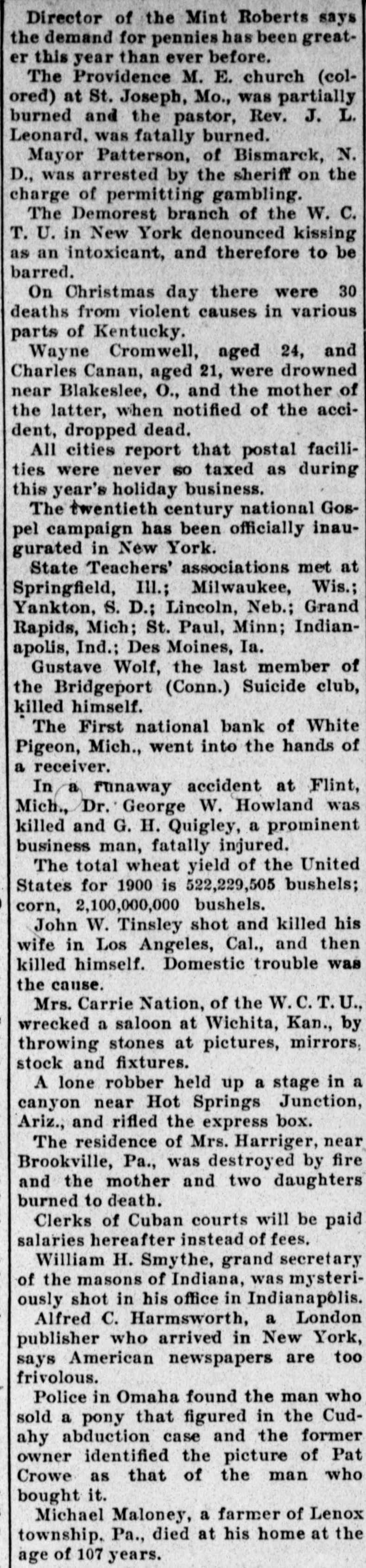 A WEEK'S RECORD All the News of the Past Seven Days Condensed. HOME AND FOREIGN ITEMS News of the Industrial Field, Personal and Political Items, Happenings at Home and Abroad. THE NEWS FROM ALL THE WORLD DOMESTIC. The sheriff of Ripley county, Ind., paid $4,000 to Mrs. L. C.Jenkins, whose husband was lynched September 14, 1897. The daughter-in-law of former United States Attorney General Miller kidnaped her seven-year-old son at Indianapolis. Roger T. Gill was named receiver of the Old Town bank. one of the bestknown banking institutions in Baltimore, Md. An attorney at Omaha says kidnapers can be sent to the penitentiary. Pat Crowe, suspect in the Cudany case, not yet located. Director of the Mint Roberts says the demand for pennies has been greater this year than ever before. The Providence M. E. church (colored) at St. Joseph, Mo., was partially burned and the pastor, Rev. J. L. Leonard. was fatally burned. Mayor Patterson, of Bismarck, N. D., was arrested by the sheriff on the charge of permitting gambling. On Christmas day there were 30 deaths from violent causes in various parts of Kentucky. All cities report that postal facilities were never SO taxed as during this year's holiday business. Wayne Cromwell, aged 24, and Charles Canan, aged 21, were drowned near Blakeslee, O., and the mother of the latter, when notified of the accident, dropped dead. The twentieth century national Gospel campaign has been officially inaugurated in New York. The Demorest branch of the W. C T. U. in New York denounced kissing as an intoxicant, and therefore to be barred. State Teachers' associations met at Springfield, Ill.; Milwaukee, Wis.; Yankton, S. D.: Lincoln, Neb.; Grand Rapids, Mich: St. Paul, Minn; Indianapolis, Ind.: Des Moines, Ia. Gustave Wolf, the last member of the Bridgeport (Conn.) Suicide club, killed himself. The First national bank of White Pigeon, Mich., went into the hands of a receiver. In a runaway accident at Flint, Mich., Dr. George W. Howland was killed and G. H. Quigley, a prominent business man, fatally injured. The total wheat yield of the United States for 1900 is 522,229,505 bushels; corn, 2,100,000,000 bushels. John W. Tinsley shot and killed his wife in Los Angeles, Cal., and then killed himself. Domestic trouble was the cause. Mrs. Carrie Nation, of the W.C.T.U., wrecked a saloon at Wichita, Kan.. by throwing stones at pictures, mirrors, stock and fixtures. A lone robber held up a stage in a canyon near Hot Springs Junction. Ariz., and rifled the express box. The residence of Mrs. Harriger, near Brookville, Pa., was destroyed by fire and the mother and two daughters burned to death. Clerks of Cuban courts will be paid salaries hereafter instead of fees. William H. Smythe, grand secretary of the masons of Indiana, was mysteriously shot in his office in Indianapolis. Alfred C. Harmsworth, a London publisher who arrived in New York, says American newspapers are too frivolous. Police in Omaha found the man who sold a pony that figured in the Cudahy abduction case and the former owner identified the picture of Pat Crowe as that of the man who bought it. The exchanges at the leading clearing houses in the United States during the week ended on the 28th aggregated $1,786,322,086 against $2,276,197.373 the previous week. The increase compared with the corresponding week of 1899 was 11.9. There were 213 business failures in the United States in the seven days ended on the 28th, against 293 the week previous and 220 the corresponding period of 1899. Edima Goldman said in New York that the anarchists had decided not 10 kill any more kings or crowned heads. Frank Richardson, a millionaire, was mysteriously murdered in his doorway at Savannah, Mo.
