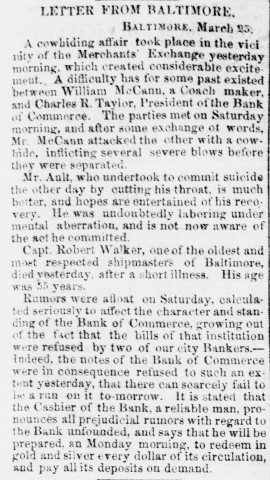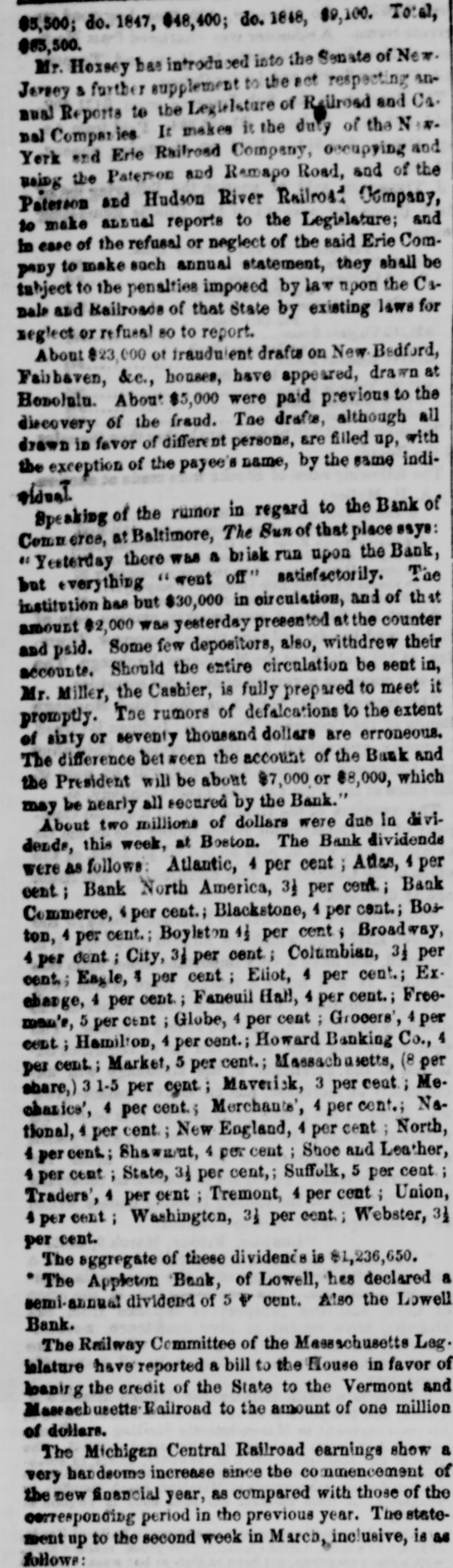 @5,500; do. 1847, $48,400; do. 1848, $9,100. Total, $85,500. Mr. Hoxsey bas introduced into the Senate of New. Jersey & further supplement to the act respecting anand Reports to the Legislature of Reilroad and Ca. nal Comparies It makes it the duty of the Nw. York end Erie Railroad Company, occupying and using the Paterson and Remapo Road, and of the Paterson and Hudson River Railrodd Company, to make annual reports to the Legislature; and in case of the refusal or neglect of the said Erie Company to make such annual statement, they shall be tubject to the penalties imposed by law upon the Canale and Bailroads of that State by existing laws for neglect or refusal 80 to report. About $23,000 of traudulent drafts on New Bedford, Fairbaven, &e., houses, have appeared, drawn at Honolulu. About $5,000 were paid previous to the discovery of the fraud. Tae drafts, although all drawn in favor of different persons, are filled up, with the exception of the payee's name, by the same individual. Speaking of the rumor in regard to the Bank of Commerce, at Baltimore, The Sun of that place says: " Yesterday there was a brisk run upon the Bank, but everything went off" satisfactorily. The institution has but $30,000 in circulation, and of that amount $2,000 was yesterday presented at the counter and psid. Some few depositors, also, withdrew their accounts. Should the entire circulation be sent in, Mr. Miller, the Cashier, is fully prepared to meet it promptly. The rumors of defalcations to the extent of sixty or seventy thousand dollars are erroneous. The difference bet ween the account of the Bank and the President will be about $7,000 or $8,000, which may be nearly all secured by the Bank." About two millions of dollars were due In dividends, this week, at Boston. The Bank dividends were as follows: Atlantic, 4 per cent ; Atlas, 4 per cent; Bank North America, 31 per cent.; Bank Commerce, 4 per cent.; Blackstone, 4 per cent.; Boston, 4 per cent.; Boylston 41 per cent; Broadway, 4 per dent. City, 31 per cent; Columbian, 31 per cent; Eagle, 4 per cent Eliot, 4 per cent.; Exchange, 4 per cent.; Faneuil Hall, 4 per cent.; Freeman's, 5 per cent ; Globe, 4 per cent Grocers', 4 per cent; Hamilton, 4 per cent.; Howard Banking Co., 4 per cent; Market, 5 per cent.; Massachusetts, (8 per share,) 3 1-5 per cent; Maverick, 3 per cent ; Mechanics', 4 per cent.; Merchants', 4 per cent.; National, 4 per cent.; New England, 4 per cent North, 4 per cent; Shawarut, 4 per cent Shoe and Leather, 4 per cent State, 31 per cent,; Suffolk, 5 per cent ; Traders', 4 per cent Tremont, 4 per cent ; Union, s per cent ; Washington, 31 per cent.; Webster, 31 per cent. The aggregate of these dividends is $1,236,650. The Appleton Bank, of Lowell, has declared a semi-annual dividend of 5 P cent. Also the Lowell Bank. The Railway Committee of the Massachusetts Leg. islature have reported a bill to the House in favor of loaning the credit of the State to the Vermont and Massachusetts to the amount of one million of dollars. The Michigan Central Railroad earnings show a very handsome increase since the commencement of the new financial year, as compared with those of the corresponding period in the previous year. The statement up to the second week in March, inclusive, is as follows: