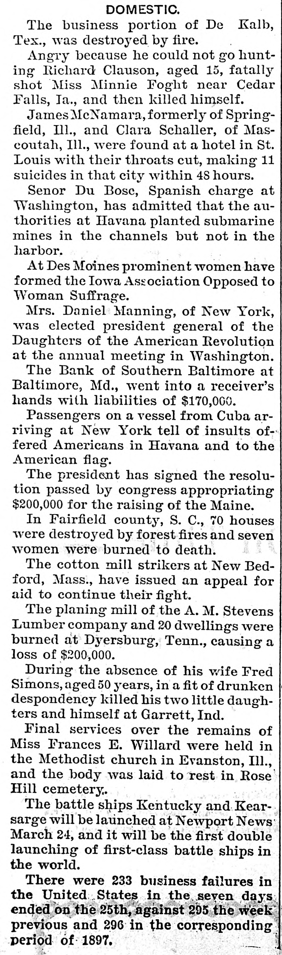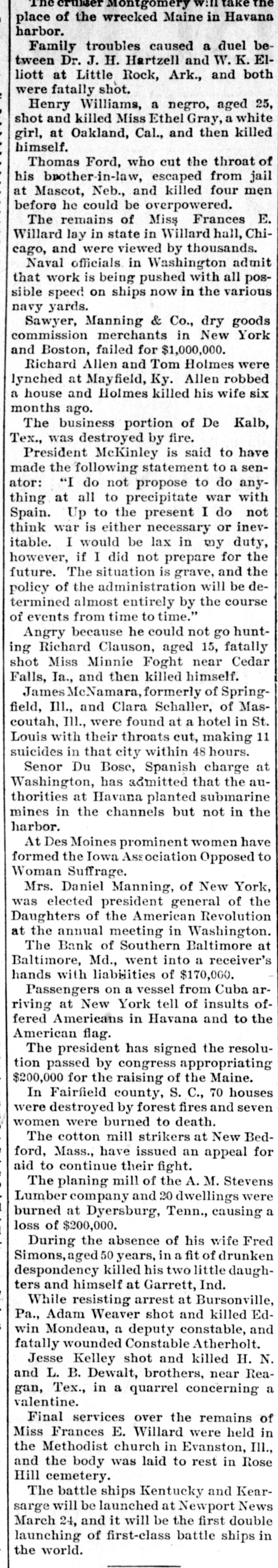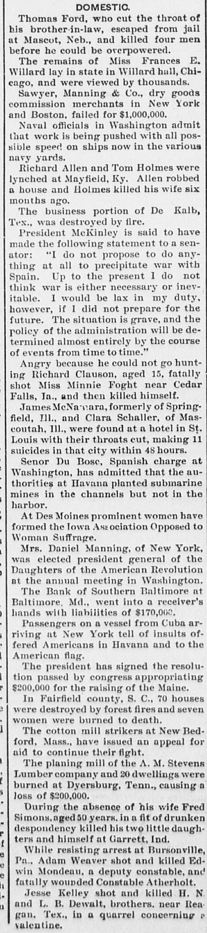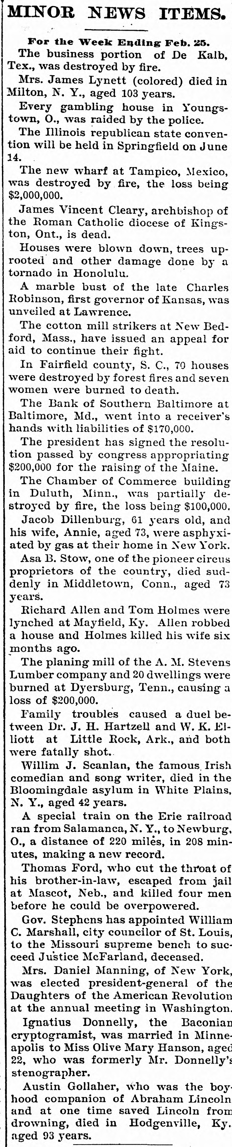 MINOR NEWS ITEMS. For the Week Ending Feb. 25. The business portion of De Kalb, Tex., was destroyed by fire. Mrs. James Lynett (colored) died in Milton, N. Y., aged 103 years. Every gambling house in Youngstown, O., was raided by the police. The Illinois republican state convention will be held in Springfield on June 14. The new wharf at Tampico, Mexico, was destroyed by fire, the loss being $2,000,000. James Vincent Cleary, archbishop of the Roman Catholic diocese of Kingston, Ont., is dead. Houses were blown down, trees uprooted and other damage done by a tornado in Honolulu. A marble bust of the late Charles Robinson, first governor of Kansas, was unveiled at Lawrence. The cotton mill strikers at New Bedford, Mass., have issued an appeal for aid to continue their fight. In Fairfield county, S. C., 70 houses were destroyed by forest fires and seven women were burned to death. The Bank of Southern Baltimore at Baltimore, Md., went into a receiver's hands with liabilities of $170,000. The president has signed the resolution passed by congress appropriating $200,000 for the raising of the Maine. The Chamber of Commerce building in Duluth, Minn., was partially destroyed by fire, the loss being $100,000. Jacob Dillenburg, 61 years old, and his wife, Annie, aged 73, were asphyxiated by gas at their home in New York. Asa B. Stow, one of the pioneer circus proprietors of the country, died suddenly in Middletown, Conn., aged 73 years. Richard Allen and Tom Holmes were lynched at Mayfield, Ky. Allen robbed a house and Holmes killed his wife six months ago. The planing mill of the A. M. Stevens Lumber company and 20 dwellings were burned at Dyersburg, Tenn., causing a loss of $200,000. Family troubles caused a duel between Dr. J. H. Hartzell and W.K. Elliott at Little Rock, Ark., and both were fatally shot. Willim J. Scanlan, the famous Irish comedian and song writer, died in the Bloomingdale asylum in White Plains, N. Y., aged 42 years. A special train on the Erie railroad ran from Salamanca, N. Y., to Newburg, O., a distance of 220 miles, in 208 minutes, making a new record. Thomas Ford, who cut the throat of his brother-in-law, escaped from jail at Mascot, Neb., and killed four men before he could be overpowered. Gov. Stephens has appointed William C. Marshall, city councilor of St. Louis, to the Missouri supreme bench to succeed Justice McFarland, deceased. Mrs. Daniel Manning, of New York, was elected president-general of the Daughters of the American Revolution at the annual meeting in Washington. Ignatius Donnelly, the Baconian cryptogramist, was married in Minneapolis to Miss Olive Mary Hanson, aged 22, who was formerly Mr. Donnelly's stenographer. Austin Gollaher, who was the boyhood companion of Abraham Lincoln and at one time saved Lincoln from drowning, died in Hodgenville, Ky. aged 93 years.
