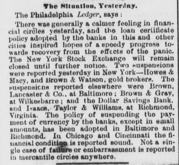 The Situation, Yesterday. The Philadelphia Ledger, says There was generally a calmer feeling in financial circles yesterday, and the loan certificate policy adopted by the banks in this and other cities inspired hopes of a speedy progress towards recovery from the effects of the panic. The New York Stock Exchange will remain closed until further notice. Two suspensions were reported yesterday in New York-Howes & Macy, and Brown & Watson, gold brokers. The suspensions reported elsewhere were Brown, Lancaster & Co., at Baltimore Brown & Gray, at Wilkeebarre ; and the Dollar Savings Bank. and I-sace. Taylor & Williams, at Richmond, Virginia. The policy of suspending the payment of currency by the banks, except in small amounts, has been adopted in Baltimore and Richmond. In Chicago and Cincinnati the financial condition is reported sound. Not a single case of failure or embarrassment is reported in mercantile circles anywhere.