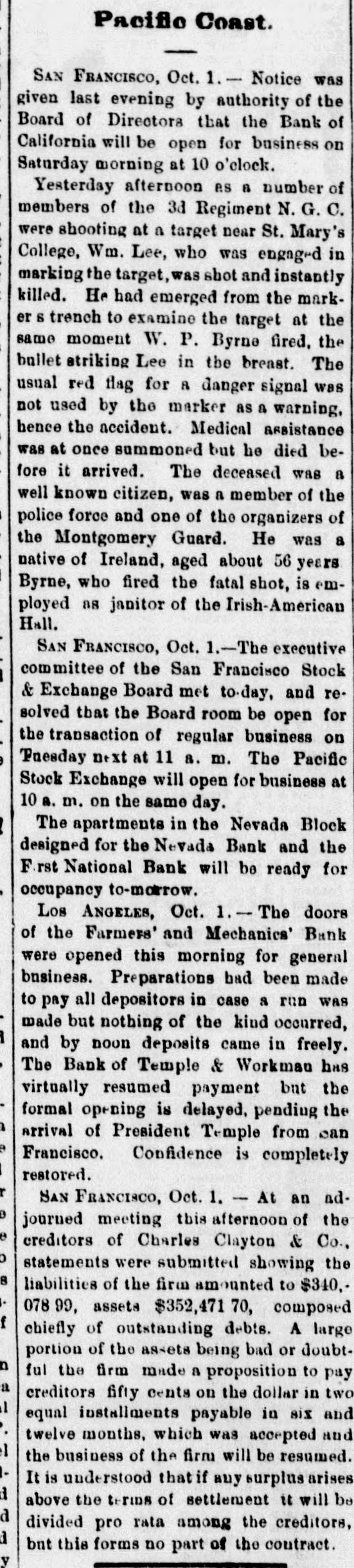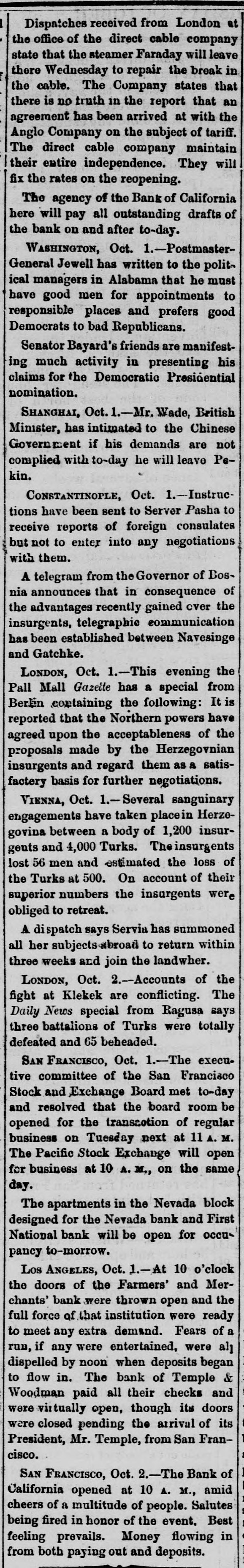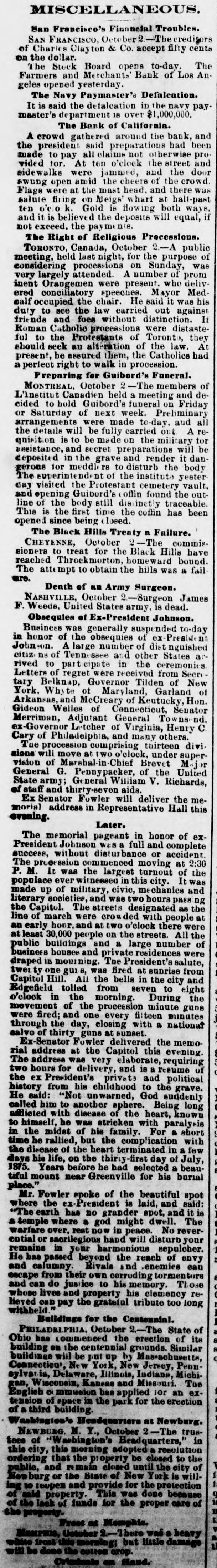 MISCELLANEOUS. San Francisco's Financial Troubles. SAN FRANCISCO, Oeteber2-Theeredito: of Charles Clay ton & Co. accept fifty cents on the dollar. The The Stock Board opens to-day. Farmers and Merchants' Bank of Los Angeles opened yesterday The Navy Paymaster's Defalcation. It is said the defalcation in the navy paymaster's department 18 over $1,000,000. The Bank of California. A crowd gathered around the bank, and the president said preparatious had been made to pay all claims not herwise provided for At ten o'clock the street and eidewalks were jammed, and the door swung open amid the cheers of the crowd. Flage were at the mast head. and there was salute firing on Meigs wharf at half-past ten o'co Gold is flowing both ways. and is believe d the deposits will equal, if not exceed, the payments. The Right of Religious Processions. TORONTO, Canada, October A public meeting, held last night, for the purpose of considering processions on Sunday. was very largely attended. A number of prom inent Orangement were present who deliv ered conciliatory epeeches. Mayor Med calf occupied the chair He said it was his duty to see the law carried out against It friends and foes without distinction. Roman Catholic processions were distaste ful to the Protestants of Toronto, they should seek an alt-ration of the law. At present, be assured them, the Catholics had a perfect right to walk in procession. Preparing for Guibord's Funeral. MONTREAL. October The members of L'institut Canadien held a meeting and decided to hold Guibord's funeral on Friday or Saturday of next week. Preliminary arrangements were made to-day. and all the details will be fully carried out A requisition is to be made on the military for assistance. and secret preparations will be deposited in the grave and render it dangerous for meddle rs to disturb the body The superintendent of the institute yester day visited the Protestant cemetery vault. and opening Guibord's offin found the outline of the body still distinctly traceable This is the first time the coffin has been opened since being closed. The Black Hills Treaty a Failure. CHEYENNE, October 2-The commis sioners to treat for the Black Hills have reached Throckmorton. homeward bound The attempt to obtain the hills was a fail are. Death of an Army Surgeon. NASHVILLE, October -Surgeon James F. Weeds, United States army is dead. Obsequies of Ex-President Johnson. Business was generally suspended to-day in honor of the obsequies of ex Preside Johnson. A large number of dist t nguished citiz ns of Tennessee and other States rived to participate in the ceremonies Letters of regret were eived from Secre tary Belknap, Governor Tilden of New York, Whyte of Maryland Garland of Arkansas, and McCreary of Keutucky, Hon. Gideon Welles of Connecticut, Senator Merriman, Adjutant General nd. ex-Governor Letcher of Virginia, Henry C Cary of Philadelphia, and many others. Tue procession comprising thirteen divi sione will move at o'clock under supervision of Marshal-in- Chief Brevet Major General G. Pennypacker, of the United State army: General William V. Richards, of staff and thirty-seven aids. Ex Senator Fowler will deliver the memorial address in Representative Hall evening. Later. The memorial pageant in honor of ex President Johnson was a full and complete success, without disturbance or accident The procession commenced moving at 2:30 P. M. It was the largest turnout of the populace ever witnessed in this city. It was made up of military, civic, mechanics and literary societies, and was two hours pass ng the Capitol. The streets designated as the line of march were crow ded with people early hour. and at two o'clock there were least 30,000 people on the streets. All the public buildings and a large number of business houses and private residences were draped in mouning. The President's salute, twei one guis, was fired at sunrise from Capitol Hill. All the bells in the city and Edgefield tolled from seven to eight o'clock in the morning. During the movement of the procession minute guns were fired: and one every filteen minutes through the day, closing with a national salvo of thirty gune at sunset. Ex-Senator Fowler delivered the memorial address at the Capitol this evening The address was very elaborate, requiring two hours for delivery, and is resume of the ex President's private and political history from his childhood to the grave. He said: "Not unwarned, God suddenly called him to another aphere. Being long afflicted with disease of the heart, known to himself, be was stricken with paralysis in the midst of his family. For a short time he rallied, but the complication with the dieese of the heart terminated in a few days his life, on the thirty first day of July, 1875. Years before be had selected a beautiful mount near Greenville for his burial place. Mr. Fowler spoke of the beautiful spot where the President is laid, and said: "The earth has no grander spot, and it is temple where god might dwell. The warfare rest now in peace. No reverential saorilegious hand will disturb your remains in your harmonious sepulcher. He has passed beyond the reach of envy and calumny. Rivals and enemies can escape from their own corroding tormentors and can do justice to his memory Those whose lives and property his clemency relieved can pay the grateful tribute too long withheld. Buildings for the Centennial. PHILADELPHIA. October -The State of Ohio has commenced the erection of its building on the centennial grounds. Similar buildings will be put up by Maseachueett Connecticut, New York, New Jersey, Penn sylvaria, Delaware, Illinois, Indians, Michigan, Wisconsin, Kaneaa and Missouri. Tue English a mmesion applied for an tension of space in the park for the erestion third building Washington's Headamarters at Newburg. NEWBURG N. Y., October 2-The trustees of "Wasbington's Headquarters," in this city, this morning adopted resolution ordering that the p:operty be closed to the public, and remain closed 