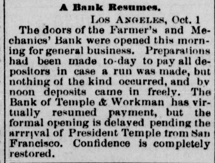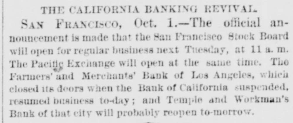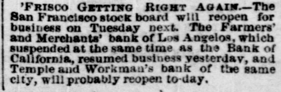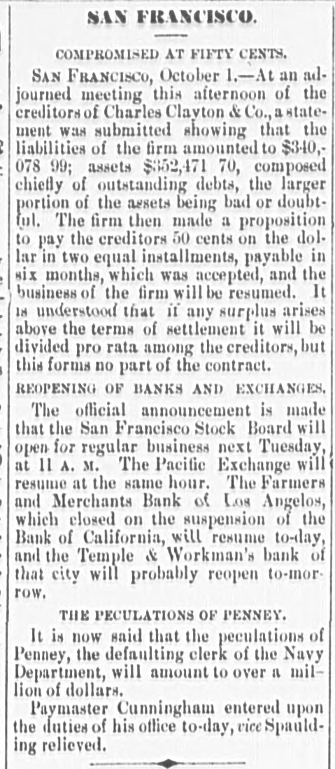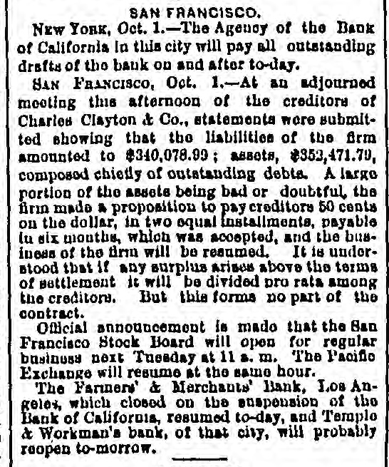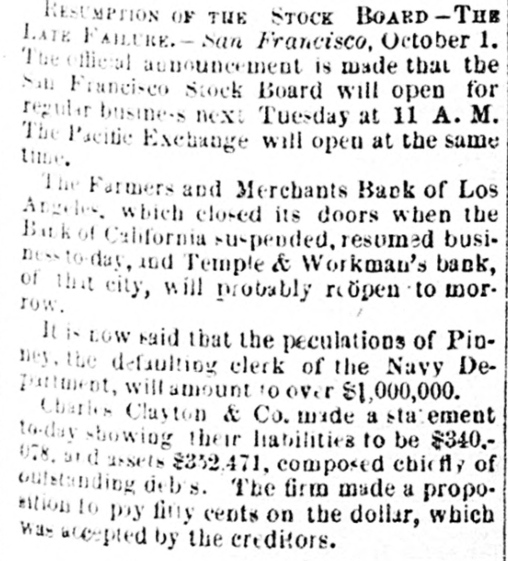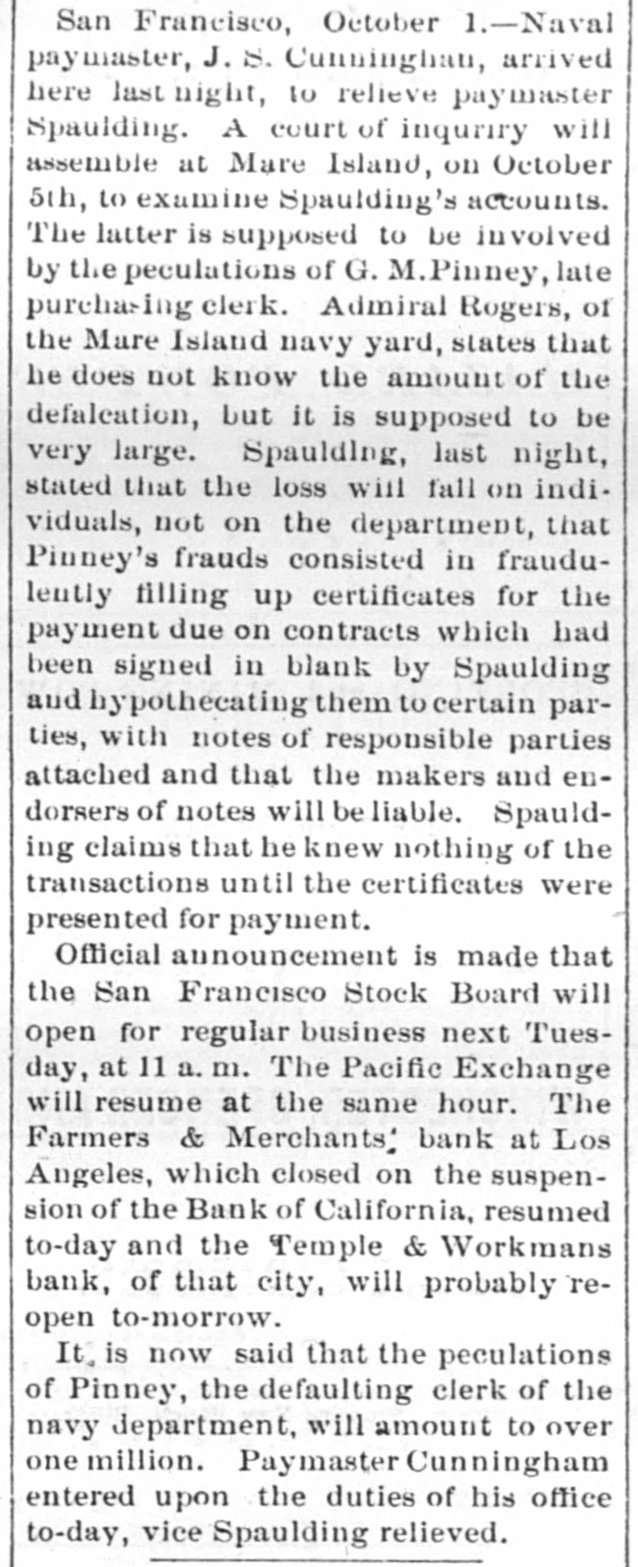 MISCELLANEOUS. San Francisco's Financial Troubles. SAN FRANCISCO, Oeteber2-Theeredito: of Charles Clay ton & Co. accept fifty cents on the dollar. The The Stock Board opens to-day. Farmers and Merchants' Bank of Los Angeles opened yesterday The Navy Paymaster's Defalcation. It is said the defalcation in the navy paymaster's department 18 over $1,000,000. The Bank of California. A crowd gathered around the bank, and the president said preparatious had been made to pay all claims not herwise provided for At ten o'clock the street and eidewalks were jammed, and the door swung open amid the cheers of the crowd. Flage were at the mast head. and there was salute firing on Meigs wharf at half-past ten o'co Gold is flowing both ways. and is believe d the deposits will equal, if not exceed, the payments. The Right of Religious Processions. TORONTO, Canada, October A public meeting, held last night, for the purpose of considering processions on Sunday. was very largely attended. A number of prom inent Orangement were present who deliv ered conciliatory epeeches. Mayor Med calf occupied the chair He said it was his duty to see the law carried out against It friends and foes without distinction. Roman Catholic processions were distaste ful to the Protestants of Toronto, they should seek an alt-ration of the law. At present, be assured them, the Catholics had a perfect right to walk in procession. Preparing for Guibord's Funeral. MONTREAL. October The members of L'institut Canadien held a meeting and decided to hold Guibord's funeral on Friday or Saturday of next week. Preliminary arrangements were made to-day. and all the details will be fully carried out A requisition is to be made on the military for assistance. and secret preparations will be deposited in the grave and render it dangerous for meddle rs to disturb the body The superintendent of the institute yester day visited the Protestant cemetery vault. and opening Guibord's offin found the outline of the body still distinctly traceable This is the first time the coffin has been opened since being closed. The Black Hills Treaty a Failure. CHEYENNE, October 2-The commis sioners to treat for the Black Hills have reached Throckmorton. homeward bound The attempt to obtain the hills was a fail are. Death of an Army Surgeon. NASHVILLE, October -Surgeon James F. Weeds, United States army is dead. Obsequies of Ex-President Johnson. Business was generally suspended to-day in honor of the obsequies of ex Preside Johnson. A large number of dist t nguished citiz ns of Tennessee and other States rived to participate in the ceremonies Letters of regret were eived from Secre tary Belknap, Governor Tilden of New York, Whyte of Maryland Garland of Arkansas, and McCreary of Keutucky, Hon. Gideon Welles of Connecticut, Senator Merriman, Adjutant General nd. ex-Governor Letcher of Virginia, Henry C Cary of Philadelphia, and many others. Tue procession comprising thirteen divi sione will move at o'clock under supervision of Marshal-in- Chief Brevet Major General G. Pennypacker, of the United State army: General William V. Richards, of staff and thirty-seven aids. Ex Senator Fowler will deliver the memorial address in Representative Hall evening. Later. The memorial pageant in honor of ex President Johnson was a full and complete success, without disturbance or accident The procession commenced moving at 2:30 P. M. It was the largest turnout of the populace ever witnessed in this city. It was made up of military, civic, mechanics and literary societies, and was two hours pass ng the Capitol. The streets designated as the line of march were crow ded with people early hour. and at two o'clock there were least 30,000 people on the streets. All the public buildings and a large number of business houses and private residences were draped in mouning. The President's salute, twei one guis, was fired at sunrise from Capitol Hill. All the bells in the city and Edgefield tolled from seven to eight o'clock in the morning. During the movement of the procession minute guns were fired: and one every filteen minutes through the day, closing with a national salvo of thirty gune at sunset. Ex-Senator Fowler delivered the memorial address at the Capitol this evening The address was very elaborate, requiring two hours for delivery, and is resume of the ex President's private and political history from his childhood to the grave. He said: "Not unwarned, God suddenly called him to another aphere. Being long afflicted with disease of the heart, known to himself, be was stricken with paralysis in the midst of his family. For a short time he rallied, but the complication with the dieese of the heart terminated in a few days his life, on the thirty first day of July, 1875. Years before be had selected a beautiful mount near Greenville for his burial place. Mr. Fowler spoke of the beautiful spot where the President is laid, and said: "The earth has no grander spot, and it is temple where god might dwell. The warfare rest now in peace. No reverential saorilegious hand will disturb your remains in your harmonious sepulcher. He has passed beyond the reach of envy and calumny. Rivals and enemies can escape from their own corroding tormentors and can do justice to his memory Those whose lives and property his clemency relieved can pay the grateful tribute too long withheld. Buildings for the Centennial. PHILADELPHIA. October -The State of Ohio has commenced the erection of its building on the centennial grounds. Similar buildings will be put up by Maseachueett Connecticut, New York, New Jersey, Penn sylvaria, Delaware, Illinois, Indians, Michigan, Wisconsin, Kaneaa and Missouri. Tue English a mmesion applied for an tension of space in the park for the erestion third building Washington's Headamarters at Newburg. NEWBURG N. Y., October 2-The trustees of "Wasbington's Headquarters," in this city, this morning adopted resolution ordering that the p:operty be closed to the public, and remain closed 