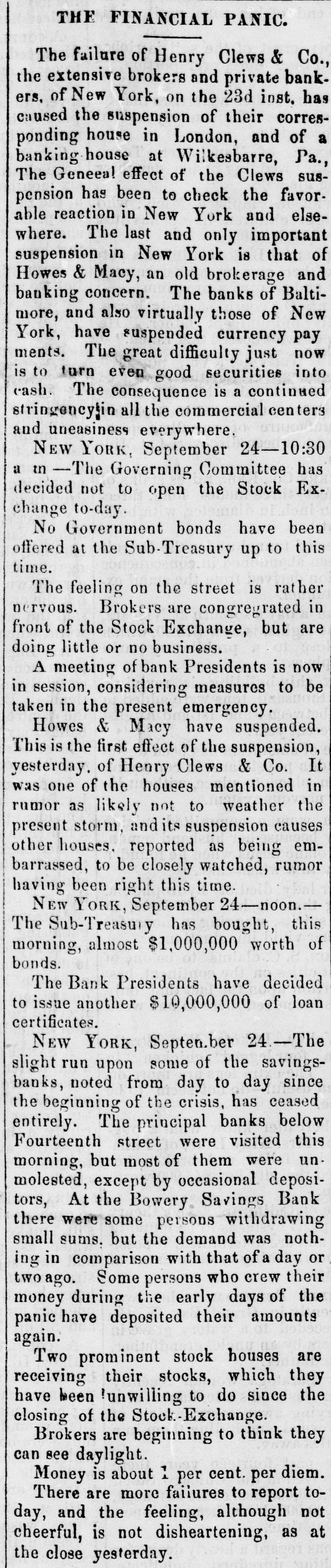THE FINANCIAL PANIC. The failure of Henry Clews & Co. the extensive brokers and private bankers, of New York, on the 23d inst. has caused the suspension of their corresponding house in London, and of a banking house at Wilkesbarre, Pa., The Geneea! effect of the Clews suspension has been to check the favorable reaction in New York and elsewhere. The last and only important suspension in New York is that of Howes & Macy, an old brokerage and banking concern. The banks of Baltimore, and also virtually those of New York, have suspended currency pay ments. The great difficulty just now is to turn even good securities into cash. The consequence is a continued stringencyin all the commercial centers and uneasiness everywhere. NEW YORK, September 24-10:30 a in -The Governing Committee has decided not to open the Stock Exchange to-day. No Government bonds have been offered at the Sub-Treasury up to this time. The feeling on the street is rather nervous. Brokers are congregrated in front of the Stock Exchange, but are doing little or no business. A meeting of bank Presidents is now in session, considering measures to be taken in the present emergency. Howes & Macy have suspended. This is the first effect of the suspension, yesterday. of Henry Clews & Co. It was one of the houses mentioned in rumor as likely not to weather the present storm, andits suspension causes other houses. reported as being embarrassed, to be closely watched, rumor having been right this time. NEW YORK, September 24-noon.The Sub-Treasury has bought, this morning, almost $1,000,000 worth of bonds. The Bank Presidents have decided to issue another $10,000,000 of loan certificates. NEW YORK, Septen.ber 24.-The slight run upon some of the savingsbanks, noted from day to day since the beginning of the crisis, has ceased entirely. The principal banks below Fourteenth street were visited this morning, but most of them were unmolested, except by occasional depositors, At the Bowery Savings Bank there were some persons withdrawing small sums. but the demand was nothing in comparison with that of a day or two ago. Some persons who crew their money during the early days of the panic have deposited their amounts again. Two prominent stock houses are receiving their stocks, which they have been !unwilling to do since the closing of the Stock-Exchange. Brokers are beginning to think they can see daylight. Money is about 1 per cent. per diem. There are more failures to report today, and the feeling, although not cheerful, is not disheartening, as at the close yesterday.