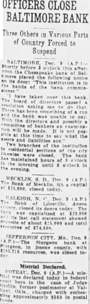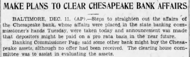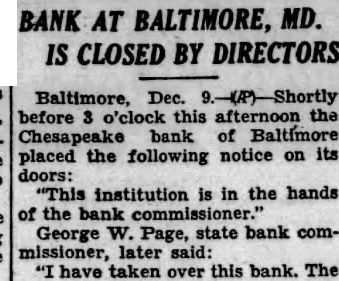 Newspapers report something of a run on the Chesapeake Bank on Dec. 9, 1930; articles do not specify a concrete trigger (no explicit rumor or misstatement identified).