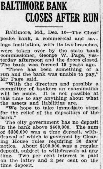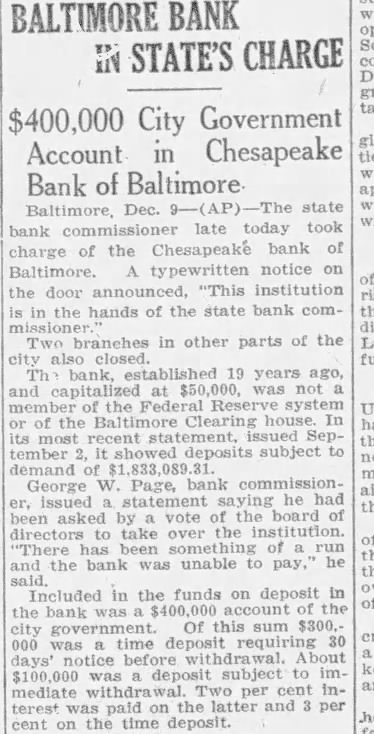 BALTIMORE BANK CLOSES AFTER RUN Baltimore, Md., Dec. Chespeake bank, commercial and savings institution, with its two branches, were taken over by the state bank commissioner, George Page, yes. terday afternoon and the doors closed. The bank was 19 years ago. "There been run and bank was unable to pay,' Mr Page "With the directors and possibly committee bankers an will be made. It not possible this time to say anything about what the assets and liabilities hope take immediate steps for the relief of the depositors of the bank." The city government has no deposit in the bank above $300,000 was time deposit, withdrawal which is governed by Clearing House rules requiring 30 days' notice. About $100,000 was regular deposit, subject to withdrawals at any time. Two cent paid on the latter and per cent on the time deposit.