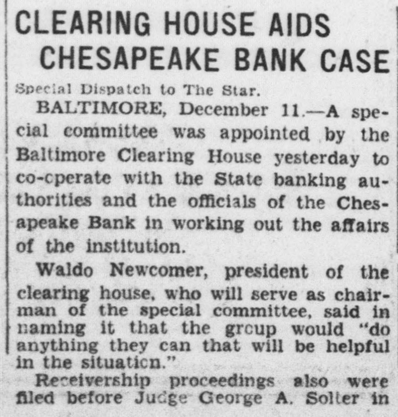 CLEARING HOUSE AIDS CHESAPEAKE BANK CASE Special Dispatch to The Star. BALTIMORE, December 11.-A special committee was appointed by the Baltimore Clearing House yesterday to co-operate with the State banking authorities and the officials of the Chesapeake Bank in working out the affairs of the institution. Waldo Newcomer, president of the clearing house, who will serve as chairman of the special committee, said in naming it that the group would "do anything they can that will be helpful in the situation." Receivership proceedings also were filed before Judge George A. Solter in