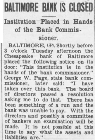 BALTIMORE BANK IS CLOSED Institution Placed in Hands of the Bank Commissioner. BALTIMORE (AP). Shortly before 3 o'clock Tuesday afternoon the Chesapeake bank of Baltimore placed the following notice on its door: "This institution is in the hands of the bank George W. Page, state bank commissioner, later said: have taken over this bank. The board of directors passed resolution asking me to do that. There has been something of a run and the bank was unable to pay. With the directors and possibly a committee of bankers an examination will be made. It is not possible at this time to say what the assets and liabilities are.