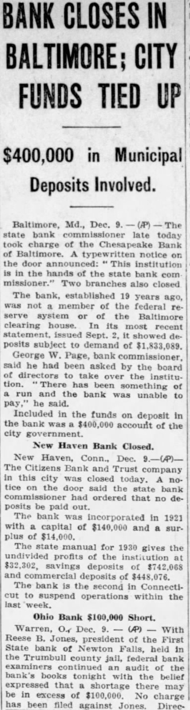 BANK CLOSES IN BALTIMORE; CITY FUNDS TIED UP $400,000 in Municipal Deposits Involved. Baltimore, Md., Dec. 9. (AP) The state bank late today took charge of the Chesapeake Bank of Baltimore. A notice on the door announced: This institution is in the hands of the state bank com missioner." Two also closed The bank, established 19 years ago, was not member of the federal resystem or of the Baltimore clearing house. In its most recent statement, Sept. 2. it deposits to demand of $1,833,089. George W. Page, bank said he had been asked by the board of directors the institution. of run and the bank was unable to pay, he said. Included in the funds on deposit in the bank was $400,000 account of the city government. New Haven Bank Closed. New Haven, Conn., Dec. The Citizens Bank and Trust company In this city was closed today. A notice on the door said the state bank had ordered that no deposits be paid The bank was incorporated in 1921 with a capital of $140,000 and a surplus of $14,000. The manual for 1930 gives the undivided profits of the at $32,302, savings deposits of $742,068 and commercial deposits of $448,076. The bank is the second in Connecticut to suspend operations within the last week. Ohio Bank $100,000 Short. Warren, O., Dec. (AP) With Reese B. Jones, president of the First State bank of Newton Falls, held in the Trumbull county jail, federal bank examiners continued an audit of the bank's books tonight with the belief expressed that shortage there may be in excess of $100,000. No charge has been filed against Jones. Direc-