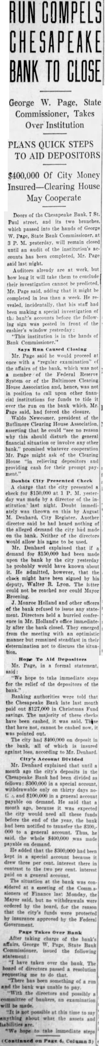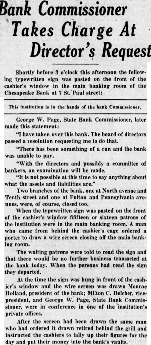 Bank Commissioner Takes Charge At Director's Request Shortly before 3 o'clock this afternoon the following typewritten sign was pasted on the front of the cashier's window in the main banking room of the Chesapeake Bank at street: This institution is in the hands of the bank Commissioner. George W. Page, State Bank Commissioner, later made this statement: have taken over this bank. The board of directors passed a resolution requesting me to do that. "There has been something of a run and the bank was unable to pay. "With the directors and possibly a committee of bankers, an examination will be made. is not possible at this time to say anything about what the assets and liabilities are." Two branches of the bank, one at North avenue and Tenth street and one at Fulton and avenues, were, of course, closed too. When the typewritten sign was pasted on the front of the cashier's window fififteen or sixteen patrons of the institution were in the main banking room. A man who came from behind the cashier's cage ordered a porter to draw a wire screen closing off the main banking room. The waiting patrons were told to read the sign and that there would be no further business transacted at the bank today. When the persons had read the sign they departed. At the time the sign was hung in front of the cashier's window and the wire screen was drawn Monroe Holland, president of the bank; Milton C. Delcher, vicepresident, and George W. Page, State Bank Commissioner, were in conference in one of the institution's private offices. After the screen had been drawn the same man who had ordered it drawn retired behind the grill and instructed the cashiers to tally up their figures for the day and put their money into the bank's vaults.