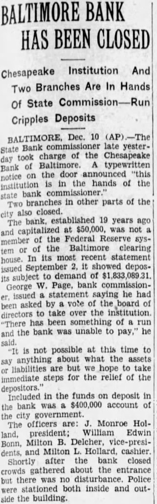 BALTIMORE BANK HAS BEEN CLOSED Chesapeake Institution And Two Branches Are In Hands Of State Commission-Run Cripples Deposits BALTIMORE, Dec. 10 (AP)-The State Bank commissioner late yesterday took charge of the Chesapeake Bank of Baltimore. A typewritten notice on the door announced "this institution is in the hands of the state bank commissioner. Two branches in other parts of the also closed. city The bank, established 19 years ago and capitalized at $50,000, was not a member of the Federal Reserve system or of the Baltimore clearing house. In its most recent statement issued September it showed deposits subject to demand of $1,833,089.31. George W. Page, bank commissioner, issued statement saying he had been asked by vote of the board of directors to take over the institution "There has been something of run and the bank was unable to pay," he said. 'It is not possible at this time to say anything about what the assets or liabilities are but we hope to take immediate steps for the relief of the depositors. Included in the funds on deposit in the bank was a $400,000 account of the city government. The officers are: J. Monroe Holland, president; William Edwin Bonn, Milton B. Delcher, vice-presidents, and Milton L. Hollard, cashier. Shortly after the bank closed crowds gathered about the entrance but there was no disturbance. Police were stationed both inside and outside the building.