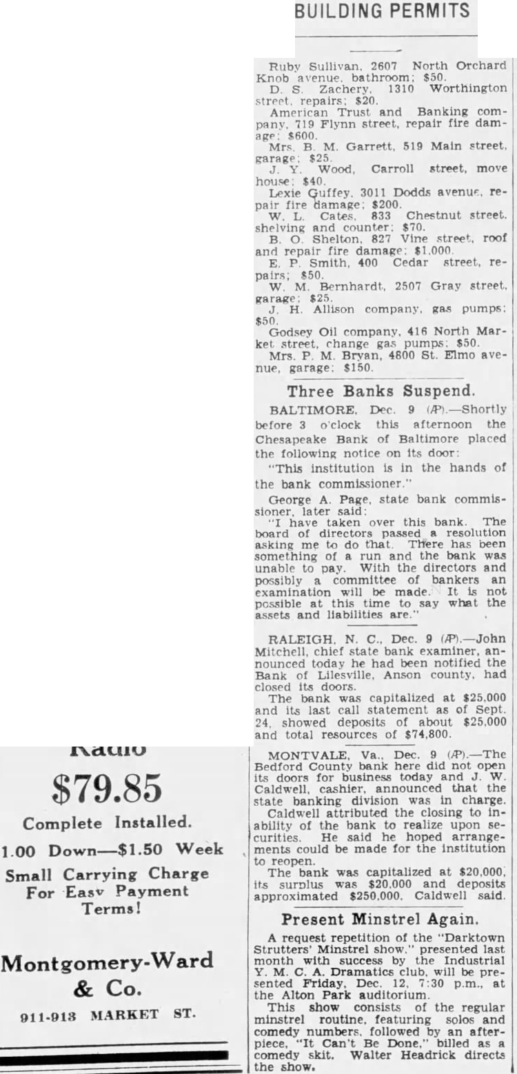 BUILDING PERMITS Ruby Sullivan 2607 North Orchard Knob Zachery 1310 Worthington and Banking company 719 Flynn street, repair fire dam$600 Mrs M Garrett, 519 Main street garage Wood, Carroll move house Lexie Guffey. 3011 Dodds avenue. refire damage $200 Cates 833 Chestnut shelving and $70. Shelton. 827 Vine street. roof and repair fire damage Smith, Cedar street, re$50 Bernhardt. 2507 Gray street. garage $25 Allison company. gas pumps Godsey Oil company. 416 North Market street change $50 Mrs. M Bryan, 4800 St. Elmo avegarage: Three Banks Suspend. before o'clock this afternoon the Chesapeake Bank of Baltimore placed the following notice on its door: "This institution is in the hands of the bank commissioner George Page state bank commissioner later have over this bank The board directors resolution asking to do There something of run and the bank unable pay With the directors and possibly of bankers examination will made possible this time what the assets and liabilities RALEIGH N. C., Dec. 9 nounced today he had notified the Bank Lilesville. Anson county. had closed its doors The bank was capitalized at $25,000 and its statement Sept showed deposits $25,000 and total resources of $74,800 County bank here did not its doors for business today $79.85 Caldwell, cashier. announced that the division in charge. the to inComplete Installed. ability of the bank realize upon curities He said he hoped arrange$1.00 Week ments could be made for the institution to reopen Small Carrying Charge The bank was capitalized at $20,000 its surplus and deposits For Easy Payment approximated $250,000. Caldwell said Present Minstrel Again. A request repetition of the "Darktown Strutters Minstrel presented Montgomery-Ward month success the Dramatics be presented Friday. Dec. 12, p.m., at & Co. the Alton Park auditorium This show consists of the regular 911-913 MARKET ST. minstrel routine. featuring solos and comedy numbers. followed by an afterpiece, Can't Be billed comedy Walter Headrick directs the show.
