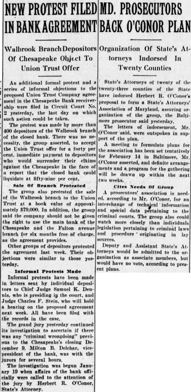 NEW PROTEST FILED PROSECUTORS O'CONOR PLAN Walbrook Of Chesapeake Object To Union Trust Offer An additional formal protest and series of informal objections proposed Union Trust Company agreement in the Bank ship were filed in Circuit Court No. yesterday, the last day on which action could be taken. The protest made by more than depositors of the Walbrook branch the closed bank. There cessity, the group asserted, accept the Union Trust offer for forty per immediate payment depositors who would surrender their claims against the Chesapeake the face report that the closed bank could liquidate at per cent. Sale Of Branch Protested The group protested the the Walbrook branch to the Union Trust book value approximately $79,000. In addition, the said the company should not be given the right use the main bank of Chesapeake and the Fulton avenue branch for six months free of charge. the provides. Other groups depositors protested the agreement last week. Their jections were similar to those yesterday. Protests Made Informal protests have been made letters sent by individual depositors to Chief Judge Samuel K. Dennis, presiding in the court, and Judge Charles Stein, will hold hearing the proposed agreement week. All have been filed with the records the case. The grand jury yesterday its investigation to ascertain there any "criminal wrongdoing" previous the Chesapeake's closing December Milton B. Delchar, president the bank, with the jurors for several hours. The investigation was begun January 19 when affairs the bank cially were called to the attention the jury by Herbert R. O'Conor, State's Attorney. Organization Of State's Attorneys Indorsed In Twenty Counties State's Attorneys of twenty of counties of the State have indorsed Herbert R. O'Conor's proposal to form State's Attorneys' Association of Maryland, assuring ganization the group, the prosecutor said yesterday. The letters indorsement, Mr. said, outspoken in support the plan. meeting formulate plans association has set February 14 Baltimore, Mr. asserted, and definite arrangements and program for the gathering drawn up within the next weeks. Cites Needs of Group prosecutors' association needaccording to Mr. for interchange technical information and special data pertaining the criminal courts. The group also watch closely than individuals legislation pertaining to criminal and procedure originating lay Deputy and Assistant State's torneys would be admitted to the associate members, but would no vote, according to present plans.