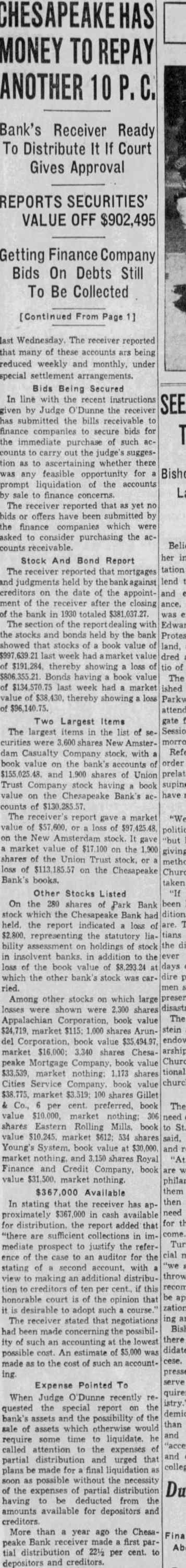 MONEY ANOTHER Bank's Receiver Ready To Distribute If Court Gives Approval REPORTS SECURITIES' OFF Getting Finance Company Bids On Debts Still To Be Collected last Wednesday. The receiver reported many of these accounts ars being reduced weekly and monthly, under special settlement Bids Being Secured In line with the recent instructions by Judge O'Dunne the receiver submitted the bills receivable finance secure bids for the immediate purchase such counts carry out the judge's tion ascertaining whether any feasible for prompt liquidation of the accounts to finance that offers have the finance companies which asked consider purchasing the counts receivable. Stock And Bond Report The receiver reported that held by lend on the date of the appointment of the the closing bank in totaled the Edward stocks bonds held by the showed that stocks book value week amarket thereby showing loss $806,355.21 Bonds having book value The $134,570.75 last week market of thereby showing Parkway Two Largest Items The largest the of New Casualty Company stock, with book value the bank's and shares of Union Trust Company stock having book value Chesapeake Bank's counts The receiver's report gave of loss of the New Amsterdam stock. market value of on the shares the Union loss the Chesapeake books. Other Stocks Listed On the 280 shares Bank been which the Chesapeake Bank held. the report indicated representing the statutory bility holdings banks. in addition to the of the book value of $8,293.24 which the other bank's stock Among other stocks which losses were shown were 2,300 Appalachian book value market shares Arun- stein book value market 3.340 shares Church peake Mortgage Company, book value market nothing: church's Cities Service Company. book value market shares per preferred, book value $10,000, market nothing: shares Eastern Rolling book value market 534 Young's System. value and and shares Royal "At Finance and Credit Company, book value market nothing. Available In stating that the receiver then need cash available for the report added that "there are in mediate prospect justify the referthe auditor for the stating second account, additional throw view making distribucreditors of per cent., honorable the opinion that zation desirable to adopt such The receiver stated that negotiations been made concerning possibilthere such accounting the lowest An estimate of was made to the cost of such accounting. Expense Pointed When Judge recently quested the special report the demic assets and the possibility the than assets which otherwise would and require some liquidate. called attention the expenses and partial distribution and urged college plans made for liquidation possible without the necessity the partial distribution having deducted from the amounts available for depositors and creditors. More than year ago the Chesapeake Bank first distribution 22½ per cent. and creditors. depositors
