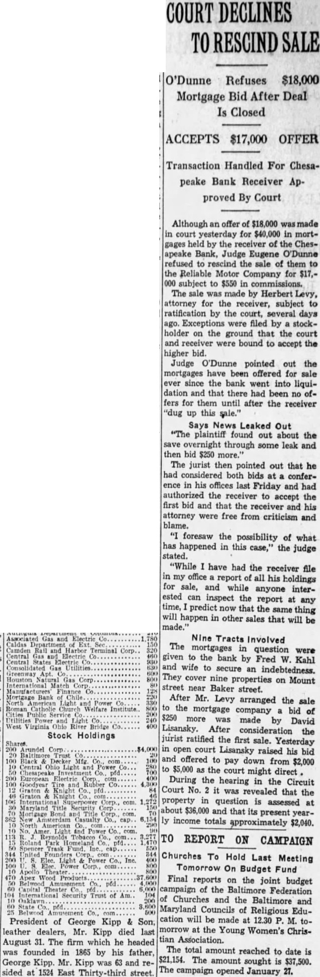 O'Dunne Refuses $18,000 Mortgage Bid After Deal Is Closed ACCEPTS $17,000 OFFER Transaction Handled For Chesapeake Bank Receiver Approved By Court Although offer of $18,000 court yesterday for $40,000 mortheld the receiver of the Chesapeake Bank, Judge Eugene refused rescind the of them to the Reliable Motor Company for $17,subject to $550 in commissions. The made by Herbert Levy, attorney for the receiver, subject to ratification by the court, several days were filed by stockholder on the ground that the court and were bound to accept the higher bid. Judge O'Dunne pointed out the mortgages have been offered for sale ever since the bank went into liquidation that there had been no offers for them until after the receiver "dug up this Says News Leaked Out "The plaintiff found out about the overnight through some leak and $250 The jurist then pointed out that he had considered both bids conference in his offices last Friday and had the accept the first bid and that the receiver his attorney were free from criticism and blame. foresaw the possibility of what has happened in this case," the judge stated. "While have had the receiver file my office report his holdings for sale, and while anyone interested can inspect the report at any time, predict that the thing happen in other sales that will be Nine Tracts Involved The were to the bank by Fred Kahl and wife to secure indebtedness. They cover nine properties on Mount Baker street. After Mr. Levy arranged the sale the mortgage company bid of more made by David After consideration jurist ratified the first sale. Yesterday open court Lisansky raised his bid and offered pay down from $2,000 $5,000 the court might direct During the hearing in the Circuit Court No. was that the property in question assessed about $36,000 and that its present yearincome totals approximately $2,040. TO REPORT ON CAMPAIGN Churches To Hold Last Meeting Tomorrow On Budget Fund Final reports the joint budget campaign the Baltimore Federation Churches and the Baltimore and Maryland Councils of Religious EduPresident of George Kipp Son, cation will be made 12.30 toat the Young Women's Chrisleather dealers, Mr. Kipp died tian Association. August 31. The firm which he headed founded 1865 The total amount reached to date in by father, The amount is George Kipp. Mr. Kipp was and sought $37,500. The campaign opened 27. sided 1524 East street. January