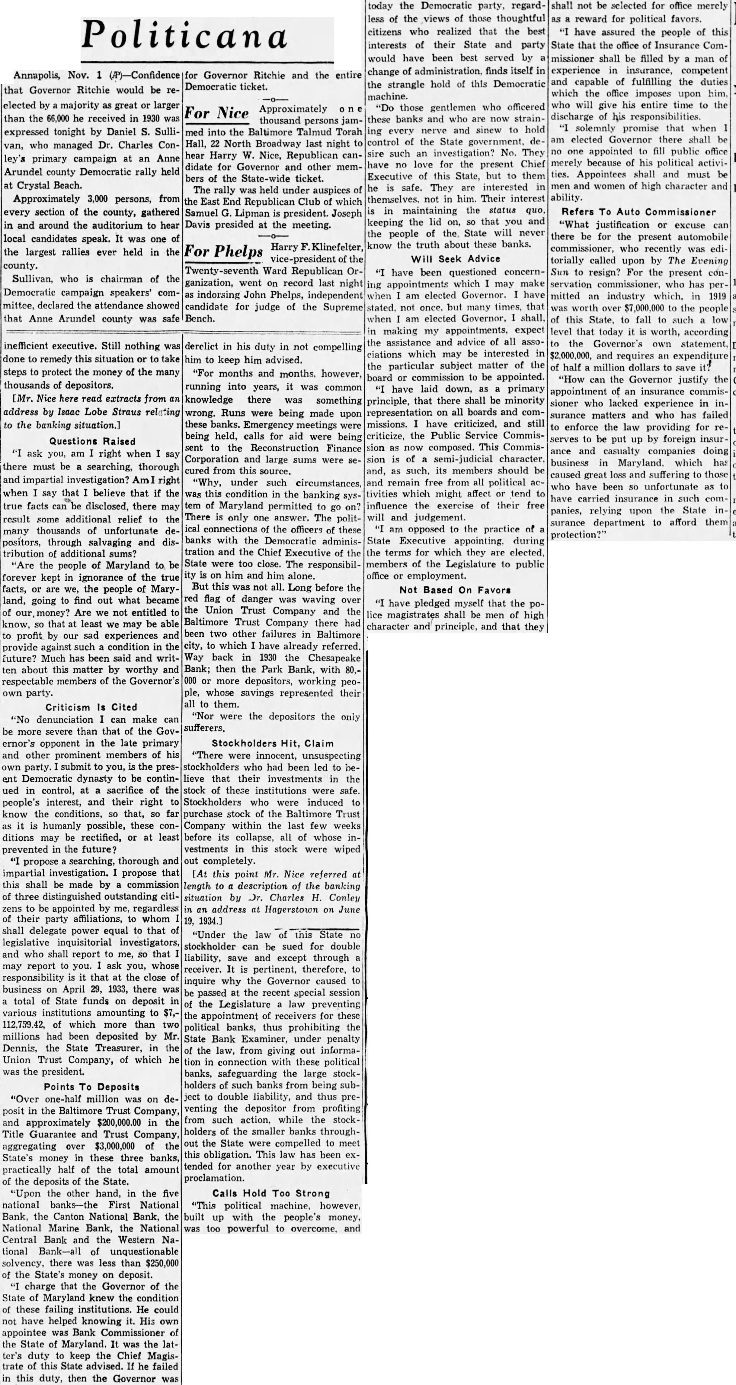 Politicana Annapolis, Nov. 1 (P)-Confidence for Governor Ritchie and the entire Democratic ticket. that Governor Ritchie would be re- elected by majority as great or larger than the 66,000 he received in 1930 was expressed tonight by Daniel S. Sullivan, who managed Dr. Charles Conley's primary campaign at an Anne Arundel county Democratic rally held at Crystal Beach. Approximately 3,000 persons, from every section of the county, gathered in and around the auditorium to hear local candidates speak. It was one of the largest rallies ever held in the county. Sullivan, who is chairman of the Democratic campaign speakers' committee, declared the attendance showed that Anne Arundel county was safe inefficient executive. Still nothing was done to remedy this situation or to take steps to protect the money of the many thousands of depositors. [Mr. Nice here read extracts from an address by Isaac Lobe Straus relating to the banking situation.] Questions Raised "I ask you, am right when I say there must be searching, thorough and impartial investigation? Am right when say that believe that if the true facts can disclosed, there may result some additional relief to the many thousands of unfortunate depositors, through salvaging and distribution of additional sums? "Are the people of Maryland to be forever kept in ignorance of the true facts, or are we, the people of Maryland, going to find out what became of our money? Are we not entitled to know, so that at least we may be able to profit by our sad experiences and provide against such condition in the future? Much has been said and written about this matter by worthy and respectable members of the Governor's own party. Criticism Is Cited "No denunciation I can make can be more severe than that of the Governor's opponent in the late primary and other prominent members of his own party. submit to you, the present Democratic dynasty to be continued in control, at sacrifice of the people's interest, and their right to know the conditions, so that, so far as it is humanly possible, these ditions may be rectified, or at least prevented in the future? "I propose searching, thorough and impartial investigation. propose that this shall be made by commission of three distinguished outstanding citizens to be appointed by me, regardless of their party affiliations, to whom shall delegate power equal to that of legislative inquisitorial investigators, and who shall report to me, so that may report to you. ask you, whose responsibility is it that at the close of business on April 29, 1933, there was total of State funds on deposit in various institutions to $7,112,759.42, of which more than two millions had been deposited by Mr Dennis, the State Treasurer, in the Union Trust Company, of which he was the president. Points To Deposits "Over one-half million was on deposit in the Baltimore Trust Company, and approximately $200,000.00 in the Title Guarantee and Trust Company, aggregating over $3,000,000 of the State's in these three banks, practically half of the total amount of the deposits of the State. "Upon the other hand, in the five national banks-the First National Bank, the Canton National Bank, the National Marine Bank, the National Central Bank and the Western National Bank-all of unquestionable solvency, there was less than $250,000 of the State's money on deposit. "I charge that the Governor of the State of Maryland knew the condition of these failing institutions. He could not have helped knowing it. His own appointee was Bank Commissioner of the State of Maryland. It was the latter's duty to keep the Chief Magistrate of this State advised. If he failed in this duty, then the Governor was Approximately For Nice thousand persons jammed into the Baltimore Talmud Torah Hall, 22 North Broadway last night to hear Harry W. Nice, Republican candidate for Governor and other members of the State-wide ticket. The rally was held under auspices of the East End Republican Club of which Samuel G. Lipman is president. Joseph Davis presided at the meeting. Harry F. Klinefelter, For Phelps vice-president of the Twenty-seventh Ward Republican Organization, went on record last night as indorsing John Phelps, independent candidate for judge of the Supreme Bench. derelict in his duty in not compelling him to keep him advised. "For months and months, however, running into years, it was common knowledge there was something wrong. Runs were being made upon these banks. Emergency meetings were being held, calls for aid were being sent to the Reconstruction Finance Corporation and large sums were secured from this source. "Why, under such circumstances. was this condition in the banking system of Maryland permitted to go on? There is only one answer. The political connections of the officers of these banks with the Democratic administration and the Chief Executive of the State were too close. The responsibility is on him and him alone. But this was not all. Long before the red flag of danger was waving over the Union Trust Company and the Baltimore Trust Company there had been two other failures in Baltimore city, to which have already referred. Way back in 1930 the Chesapeake Bank; then the Park Bank, with 80,000 or more depositors, working people, whose savings represented their all to them. "Nor were the depositors the only sufferers. Stockholders Hit, Claim "There were innocent, unsuspecting stockholders who had been led to believe that their investments in the stock of these institutions were safe. Stockholders who were induced to purchase stock of the Baltimore Trust Company within the last few weeks before its collapse, all of whose investments in this stock were wiped out completely. [At this point Mr. Nice referred at length to a description of the banking situation by Dr. Charles H. Conley an address at Hagerstown on June 19, 1934.] "Under the law of this State no stockholder be sued for double liability, save and except through receiver. It is pertinent, therefore, t