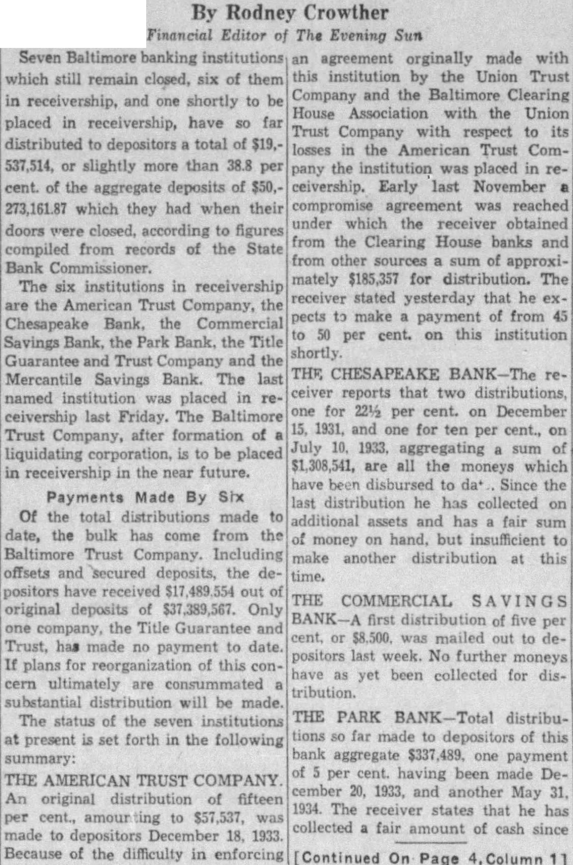 By Rodney Crowther Financial Editor The Evening Sun Seven Baltimore which remain closed, six of them in receivership, and one shortly to placed in receivership, have far distributed depositors total 537,514, slightly more than cent. of the aggregate deposits of 273,161.87 which they had when their doors to figures compiled from records the State The six institutions in receivership the American Trust Company, the Chesapeake the Commercial Savings Bank, the Park Bank. the Title Guarantee Trust Company and the Savings Bank. The last named placed in ceivership last Friday. The Baltimore Trust after of to be placed in in the near future. Payments Made By Six Of the total distributions made the bulk has come from the Baltimore Trust Company. Including offsets and secured deposits, the positors out original deposits $37,389,567. Only the Title Guarantee has If plans of this are will be made. The status of the seven institutions present set forth in the following summary: THE AMERICAN TRUST COMPANY An original distribution of fifteen amour to $57,537, 18, 1933. Because of the difficulty in enforcing agreement orginally made with institution the Union Trust Company and the Baltimore Clearing House Association with the Union Trust Company with respect to its losses in the American Trust Company the institution was placed in ceivership. Early last November compromise reached under which the receiver obtained from the Clearing House banks sources of approximately $185,357 for distribution. receiver stated yesterday that he pects make payment from per cent. on this institution shortly. THE CHESAPEAKE reports that distributions, for per cent. on December 1931, and one for ten cent., per aggregating are the moneys which have Since the distribution he has collected has fair money on hand, but another distribution this THE COMMERCIAL first distribution of five mailed out positors last week. No further yet been collected for tribution. THE PARK distribufar made depositors of this aggregate one payment per having been made 1933, and another May 1934. The receiver states that he collected fair amount of cash since [Continued On Page