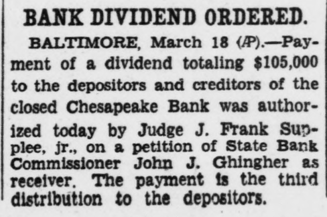 Newspapers (Dec 1934 and Mar 1935) state the Chesapeake Bank was closed and in receivership with distributions being made by the State Bank Commissioner. No article describes a depositor run; closure appears to be a government-ordered receivership and permanent (receivers making distributions).